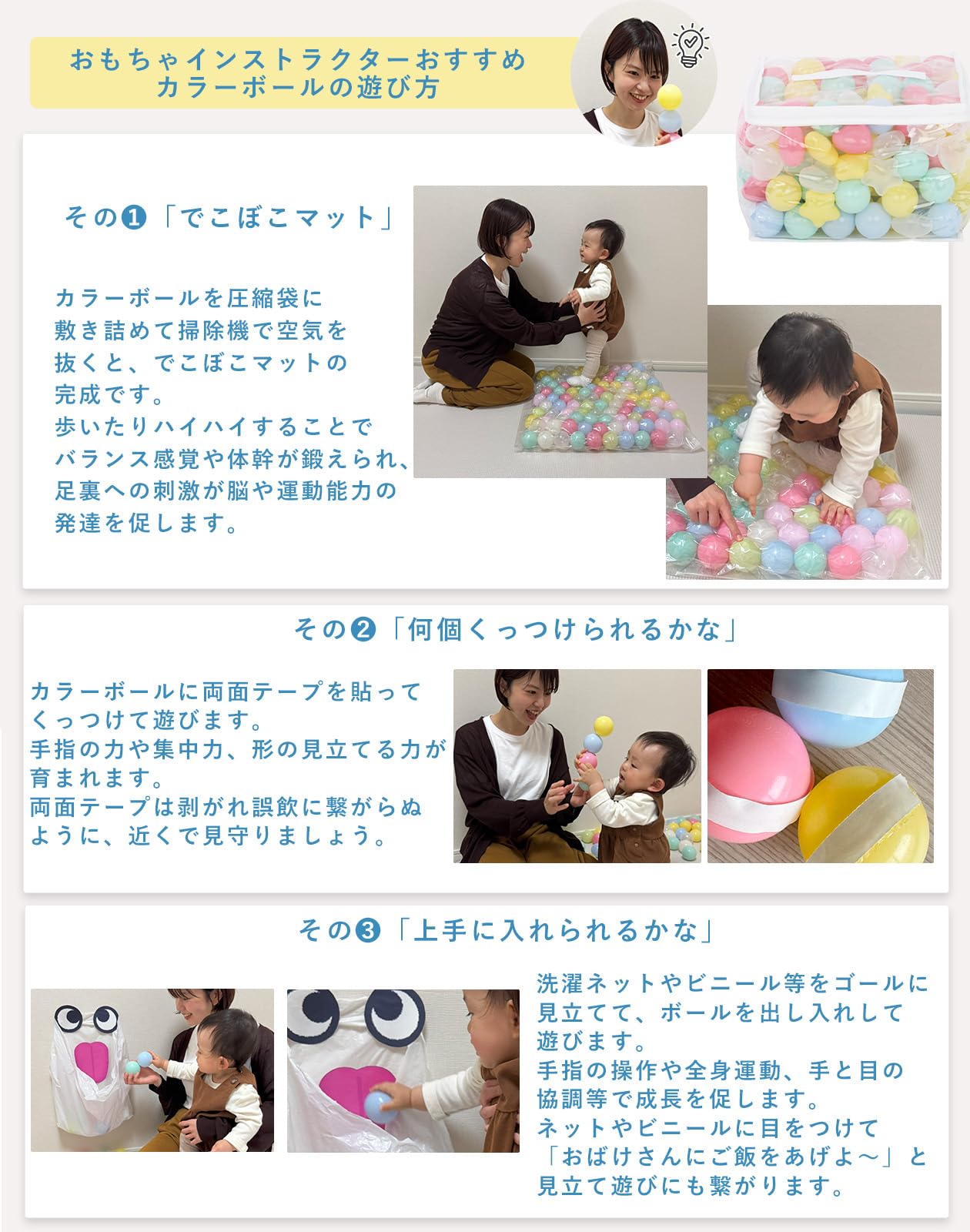 【遊びながら発達を促すカラーボール】指先を使うので脳に刺激を与え、発達を促します。ボールを投げて遊ぶことでコントロール力を育てます。・ボールプールは遊びの幅が広いため運動能力の向上が期待できます。