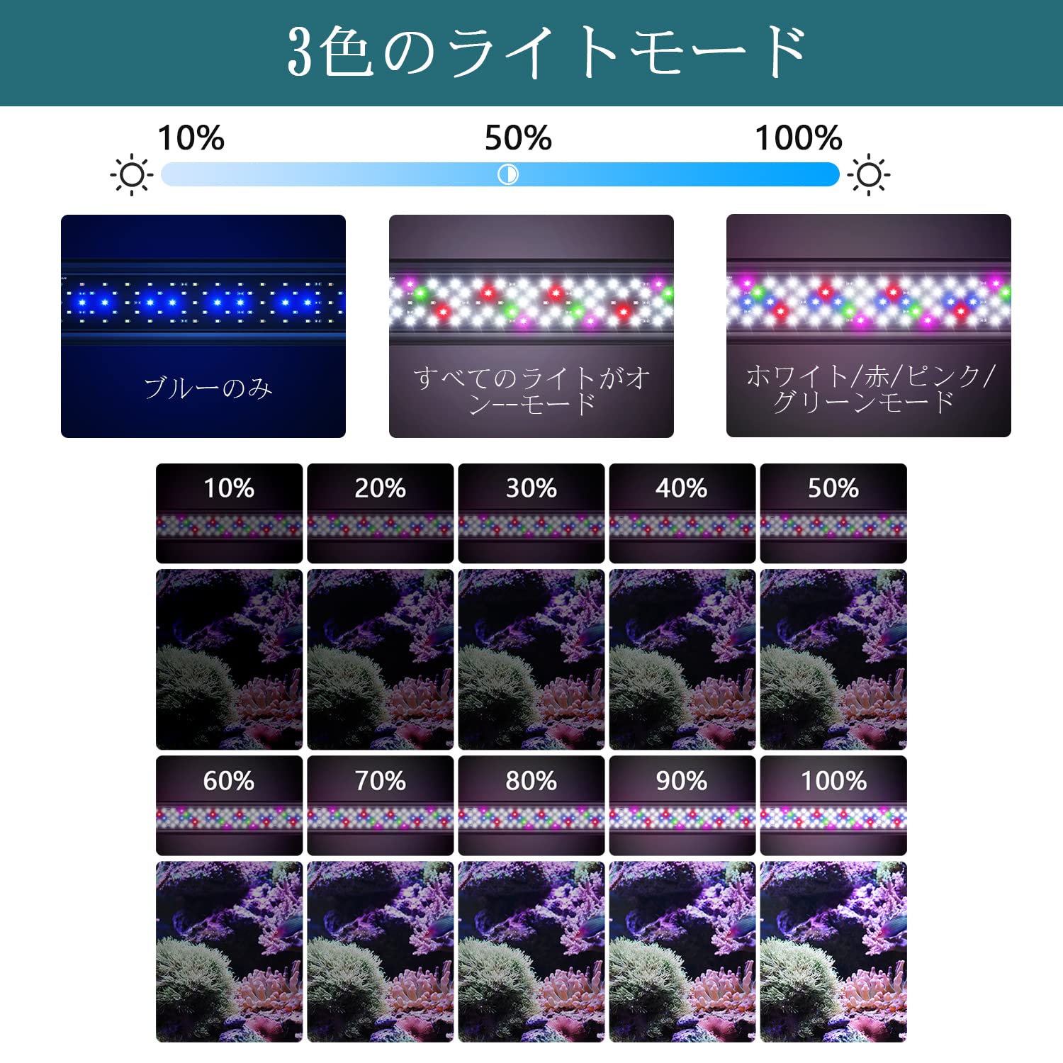 「3つの照明モード&10段階の明るさ」照明ライトは3つのモードがあり、すべてのライトが点灯し、白/赤/緑/ピンク、青のライトから選択できます。または 10%-20%-30%-40%-50%-60%-70%-80%-90%-100%-90%-80%-70%-60%-50%-40%-30%-20%-10% -0%「白/赤/粉/緑LEDビーズがオフ」の10段階の明るさ調整し、飼育のニーズに合わせて、、お好みのモードを選択できます;フルスペクトル照明は熱帯魚、観賞魚飼育と水草育成などにも有利です。