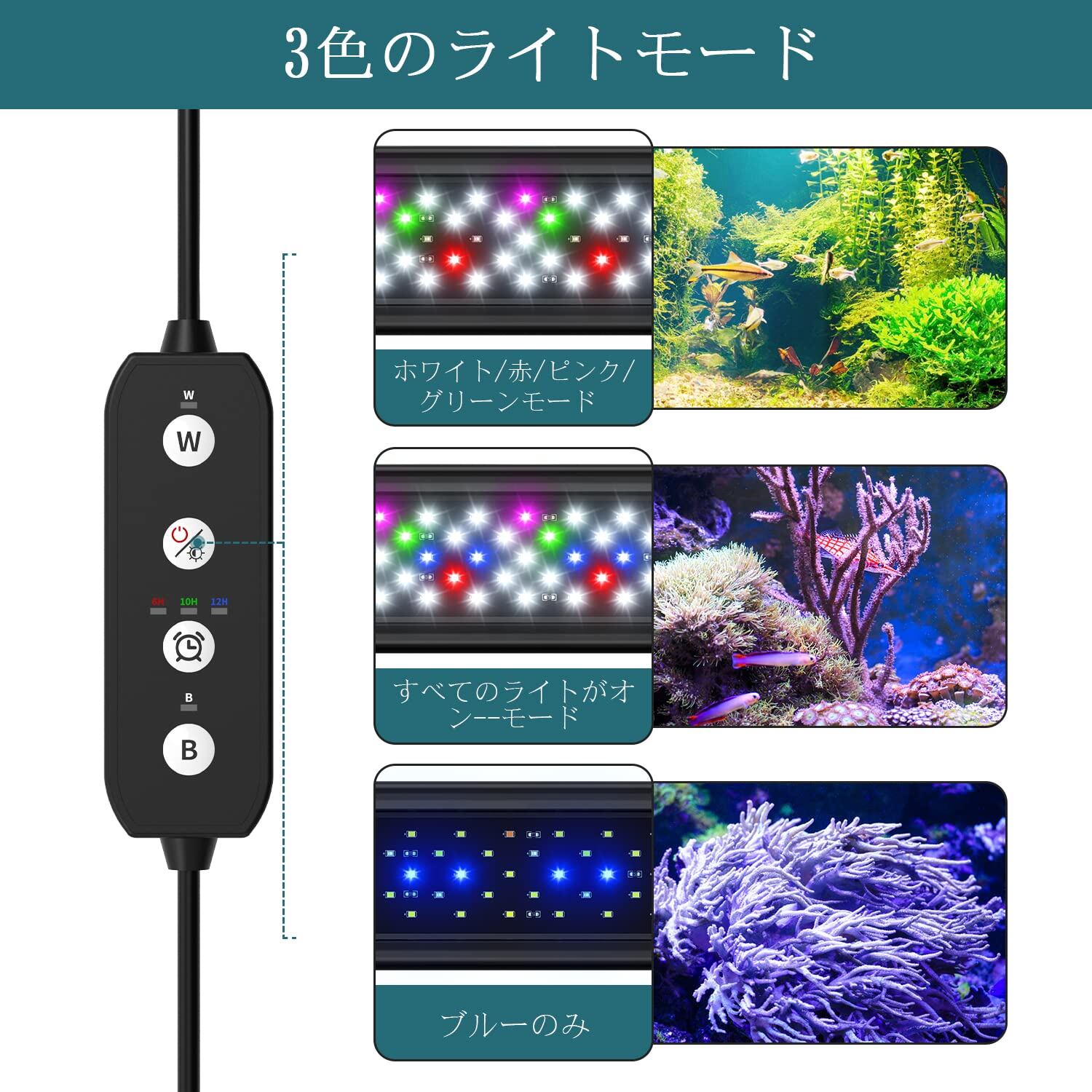 「機能設置可能」2023年の水槽ライトは時間、モード、明るさを設定できます、タイマー時間はを6時間、10時間、12時間; 3つモードは、すべてのライトが点灯、白/赤/緑/ピンクライト、青のライトです;また10段階の明るさも調整できます;