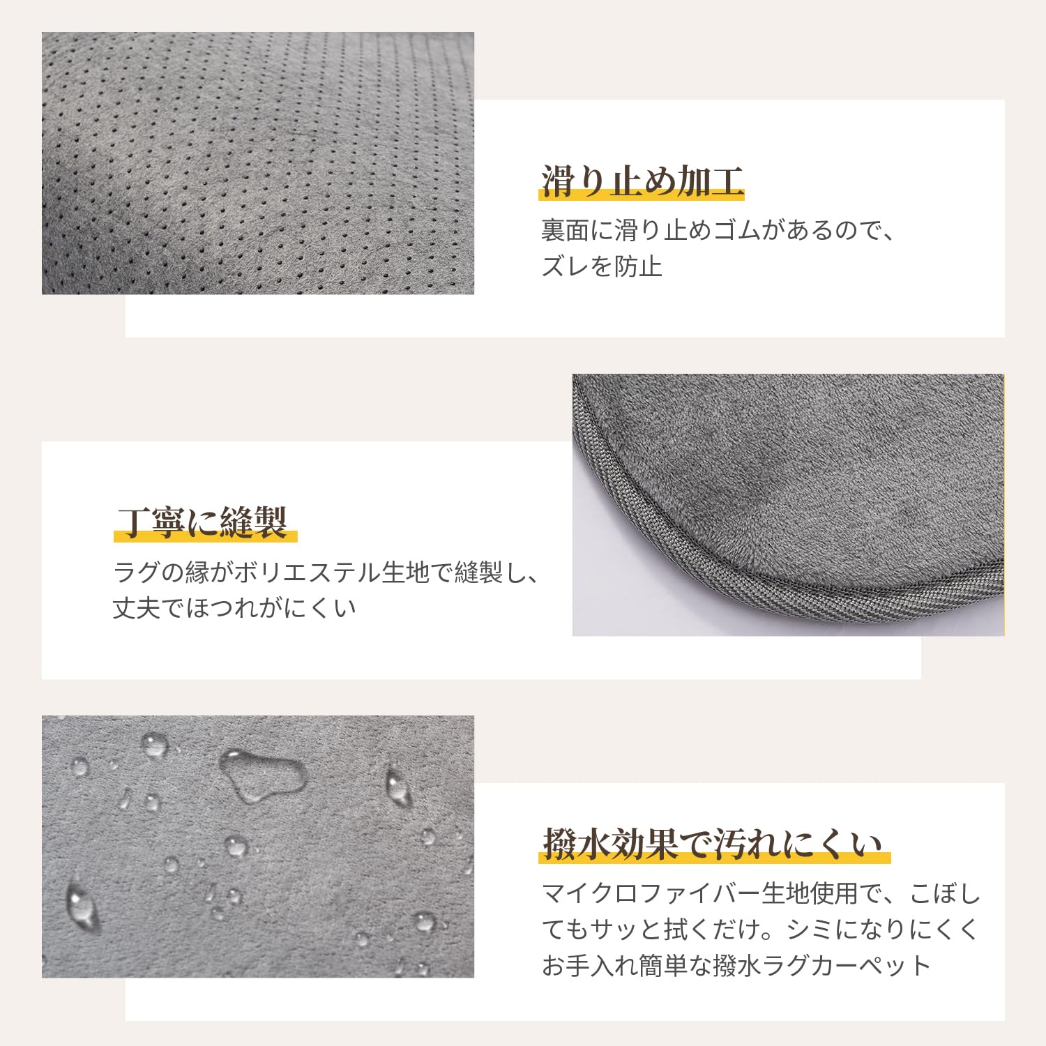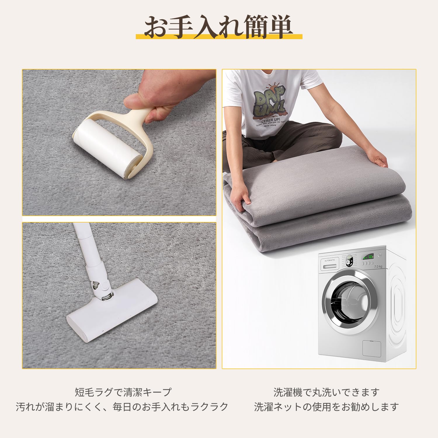 【撥水加工でお手入れ簡単・洗えるラグ】この洗えるラグは、表面に撥水加工が施されたカーペット仕様で、飲み物などをこぼしてもサッと拭くだけでお手入れ簡単。※完全防水ではありませんので、早めの対応をおすすめします。さらに、洗濯機で丸洗いできるラグとして、日々のお手入れもラクラク。掃除機もかけやすい設計で、ホコリやゴミが絡みにくく、常に清潔な状態をキープできます。軽量タイプの厚手カーペットなので、女性でも持ち運びしやすく、模様替えや掃除にも便利