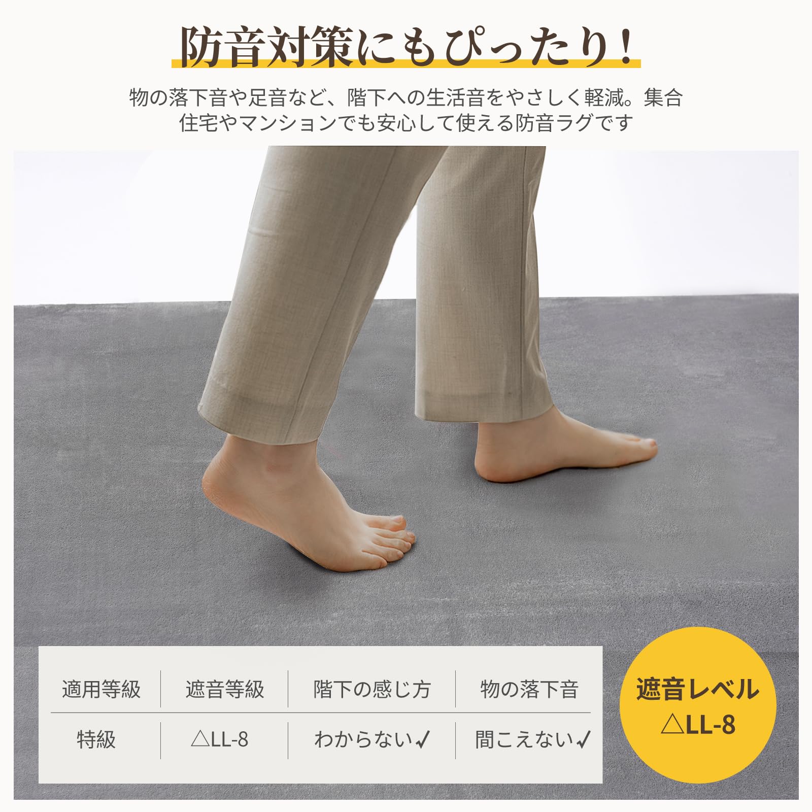 【生活音を軽減・防音ラグ】適度な厚みとクッション性がある厚手ラグマットは、生活音や足音をしっかり吸収。階下への音漏れを防ぐ防音効果で、マンションやアパートなど集合住宅にぴったり。低反発カーペットが衝撃を吸収し、お子様やペットがいるご家庭でも安心してご使用いただけます。家族全員がくつろげる、快適なリビング空間を演出します。このおしゃれなラグマットはリビングルームや寝室に適しています。