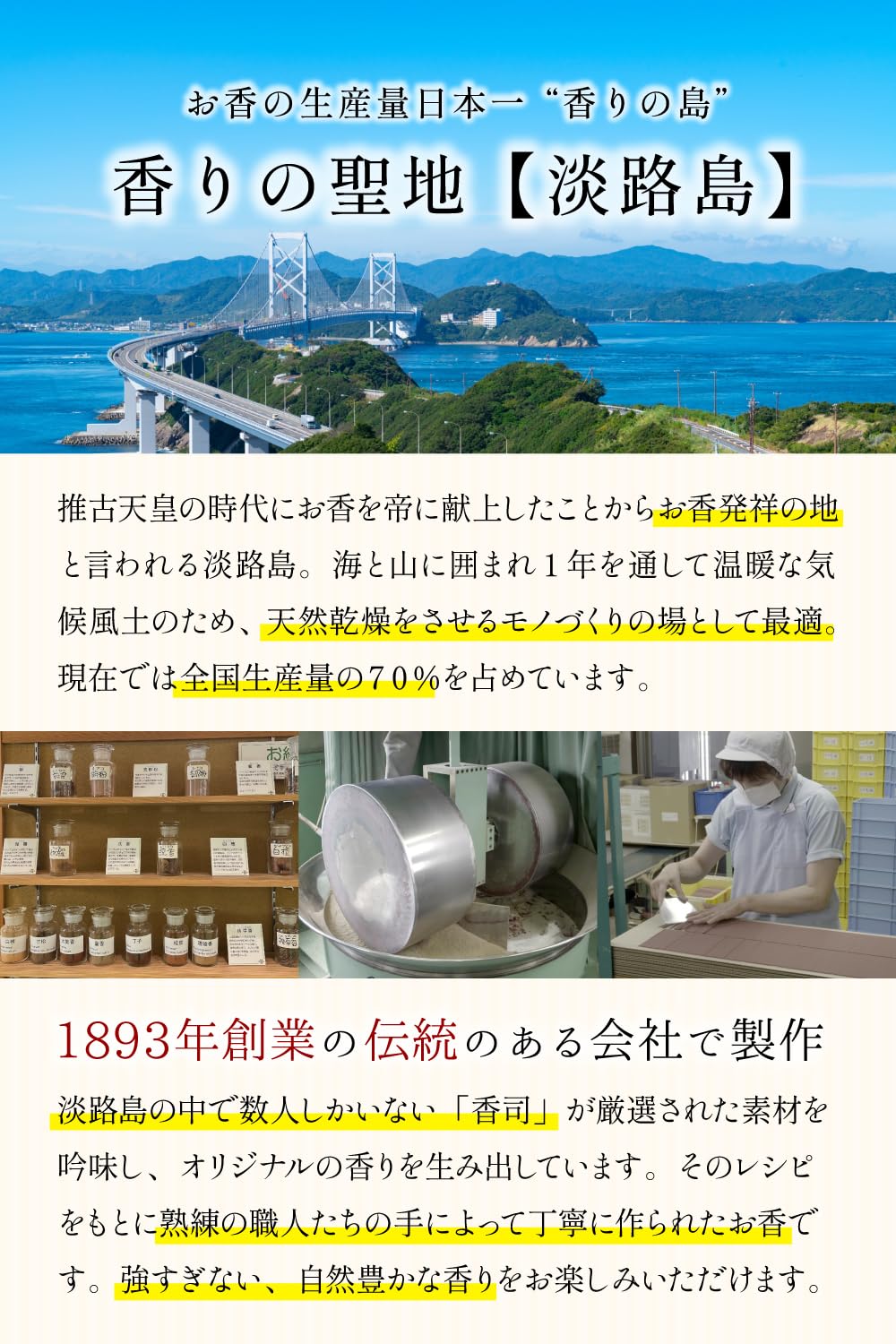 【淡路島の香司が独自にブレンド/門外不出の秘伝の香り】お香の生産量日本一“香りの島”淡路島。その淡路島で創業して130年以上の歴史を持つ会社にご協力いただいて作ったお香です。淡路島の中で数人しかいない「香司」が素材を吟味し、調合したオリジナルの香りとなっています。香司が作成したレシピをもとに熟練職人が130年以上受け継がれてきた伝統製法を用いて製作。強すぎない自然な香りをお楽しみいただけます。