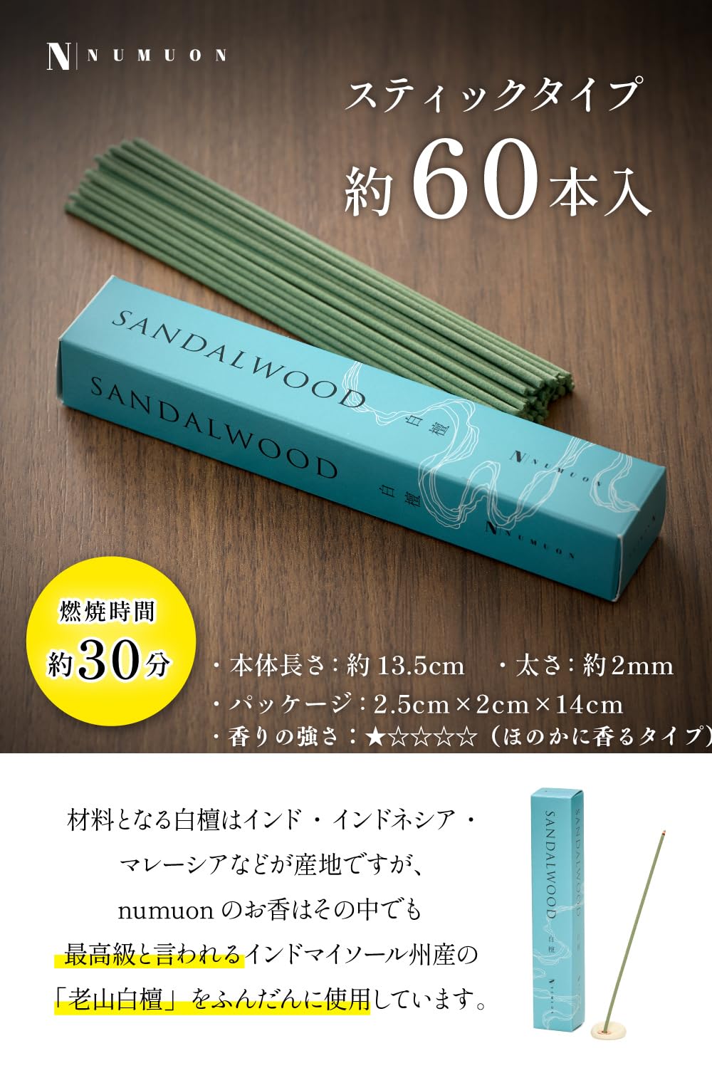 【商品詳細】◆スティックタイプ約60本入 ◆香り:白檀 ◆主原料:インドマイソール州産「老山白檀」 ◆産地:兵庫県淡路島 ◆燃焼時間:1本約30分 ◆本体長さ:約13.5cm、太さ:約2mm ◆パッケージ:2.5cm×2cm×14cm ◆ブランド名:numuon ◆安心してお試しいただけるよう30日間の返品がついております。※お香立は付属しておりません。あらかじめご準備してからご使用ください。