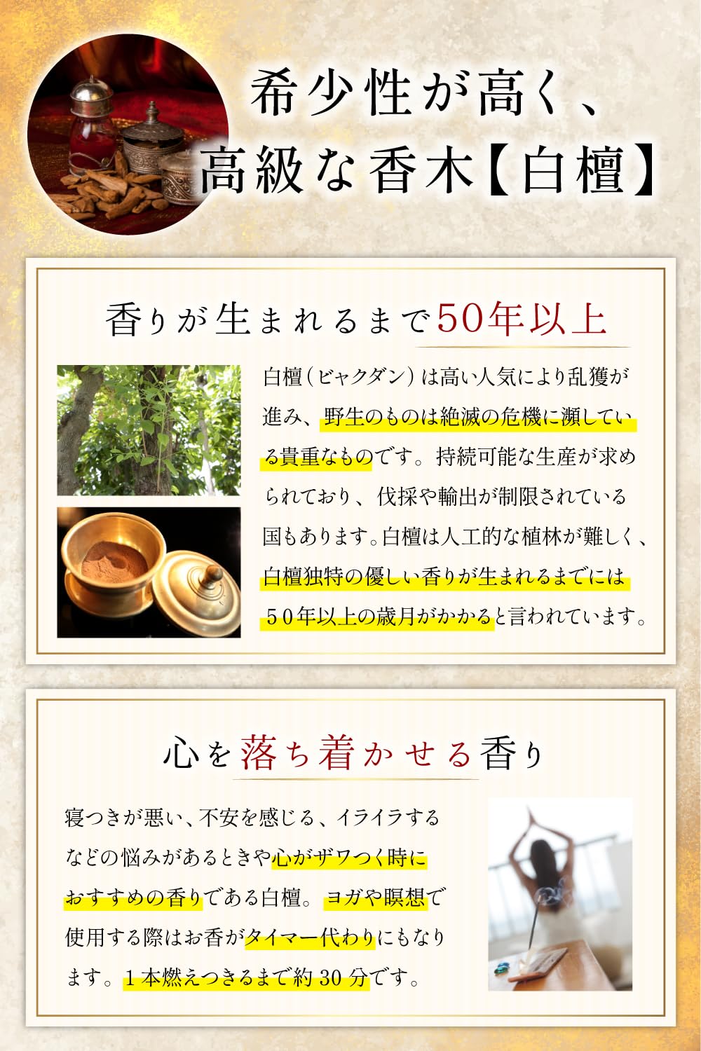 【心を落ち着かせるやさしい香り】「寝つきが悪い」「不安を感じる」「イライラする」「気分が落ち込む」などの悩みがある時や心がザワつく時におすすめ。白檀(英名:サンダルウッド)は、アロマセラピーでも人気の高い香りです。ヨガや瞑想で使用する際は、線香がタイマー代わりにもなります。1本燃えつきるまで約30分です。