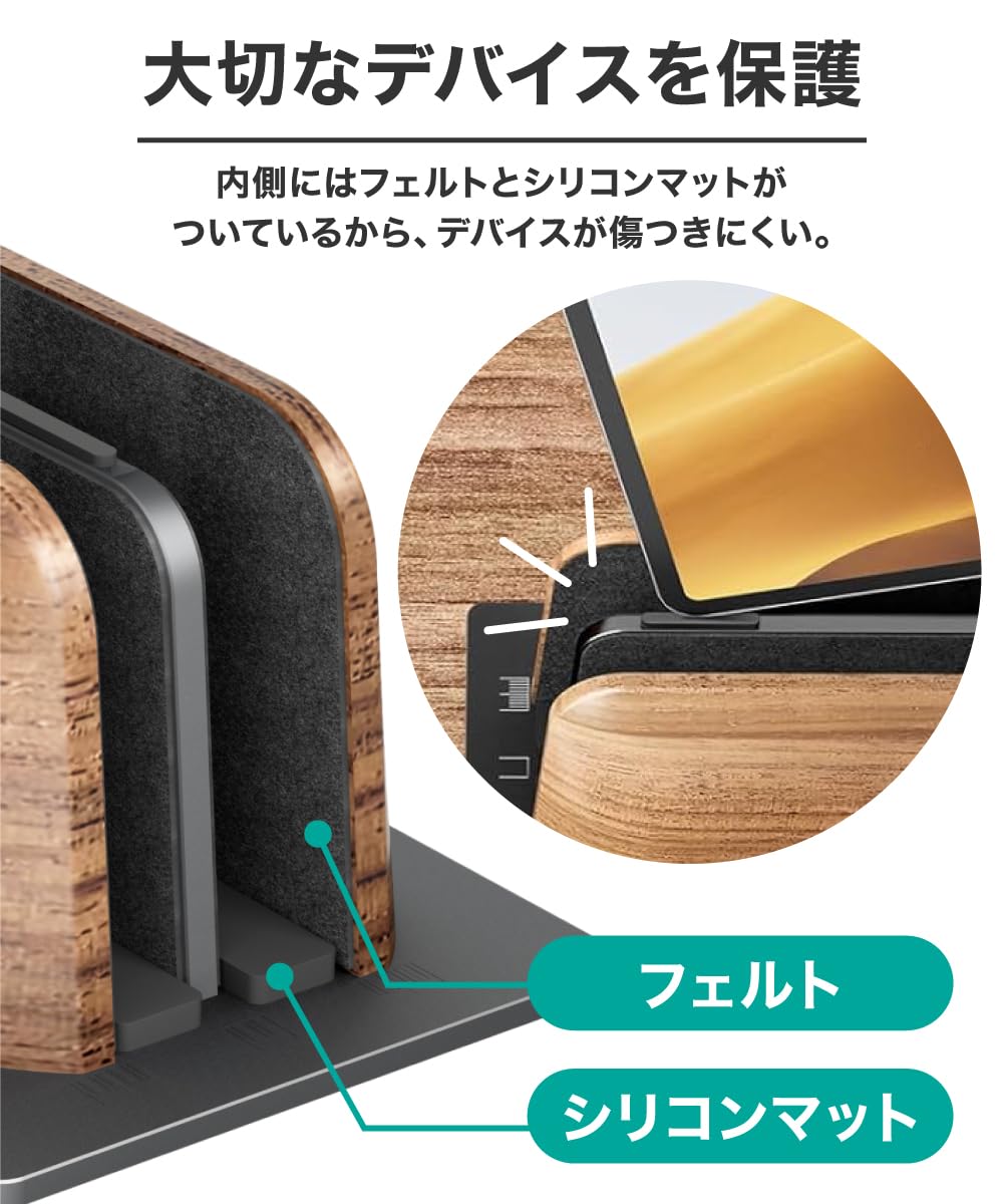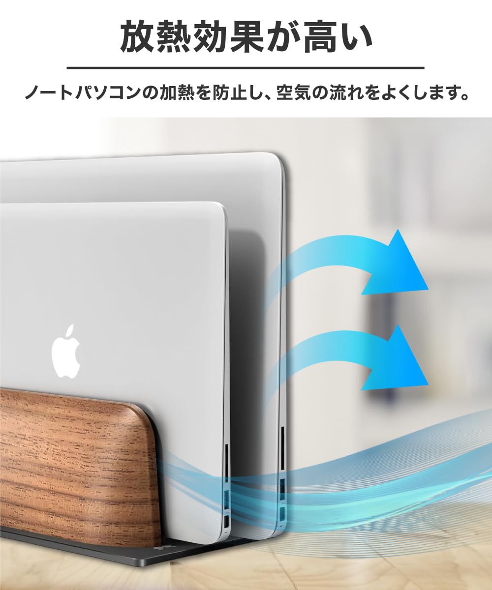 【 冷却効果とデバイス保護 】縦置きにすることで接地面が少ななり、ノートパソコンクーラーとして放熱効果が期待でき、長時間の使用でも過熱を防ぎます。さらに、ウォルナット材のパネルには傷防止パッドが付いており、アルミニウムパネルにはシリコンパッドが装備されているため、デバイスを傷や損傷からしっかりと守ります。