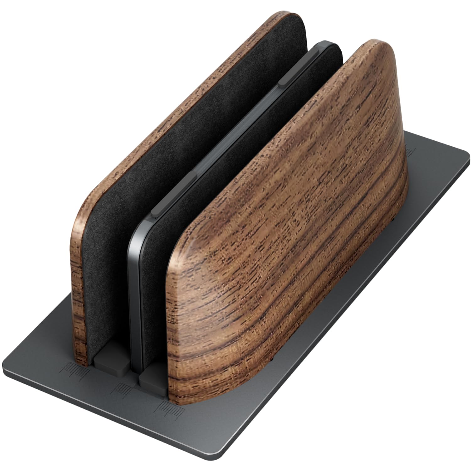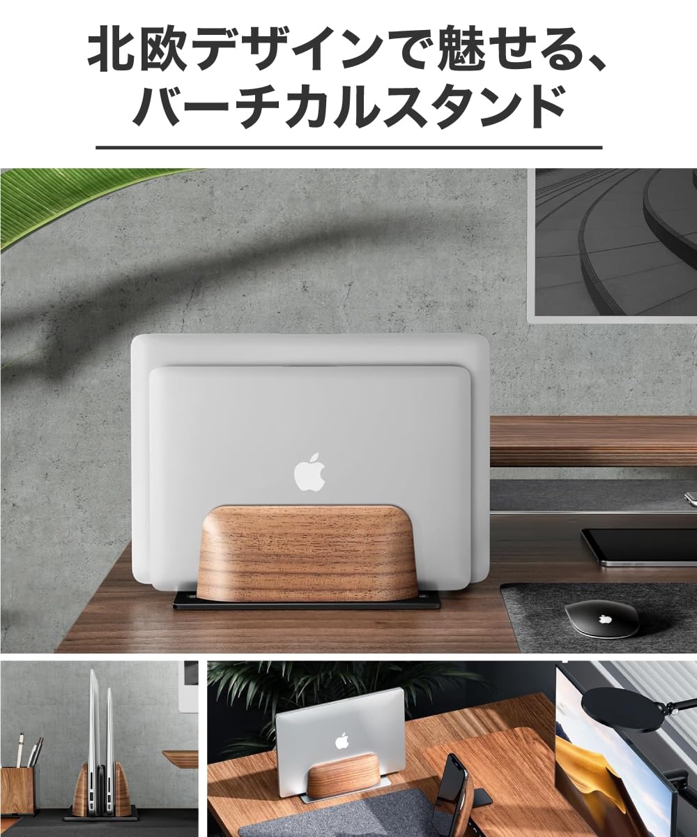 【 縦置き パソコンスタンド 】ブラウンウォルナット材とアルミニウムを使用した 2台 対応 縦型 ノートパソコンスタンド。MacBook Pro、Surface、Galaxy Book、Lenovo、HP、Dell、Chromebook、ThinkPadなど、最大17インチまでのノートパソコンやタブレットに対応。自然な素材とアルミニウムの豊かさや魅力を組み合わせた、視覚的に美しいデザインです。上質な素材を使用し、仕事を快適で楽しいものにすることをサポートします。