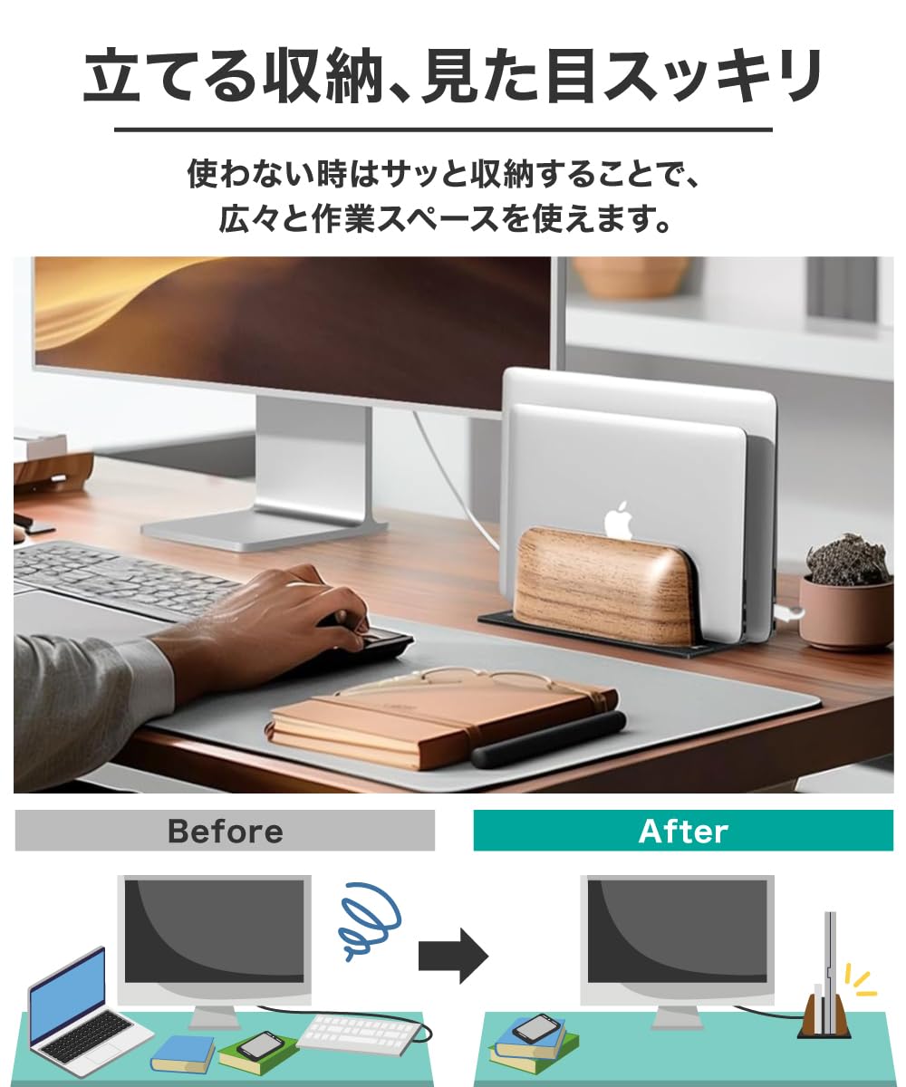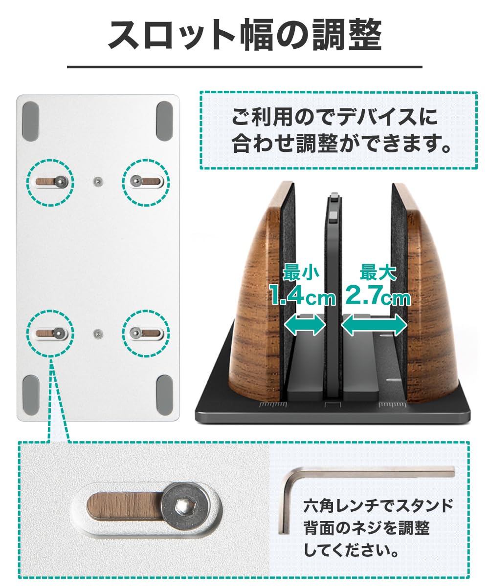 【 調整可能なデュアルスロットデザイン 】2台のノートパソコンを同時に立てて配置できる縦型パソコンスタンド。幅を自由に調整できるので、厚さ最大2.7cmまでのノートパソコンに対応。卓上のスペースを有効活用し、デバイスをすっきりと整理。シンプルで整理された作業環境を整えることで、仕事の効率を向上させ、充実した日常を実現します。