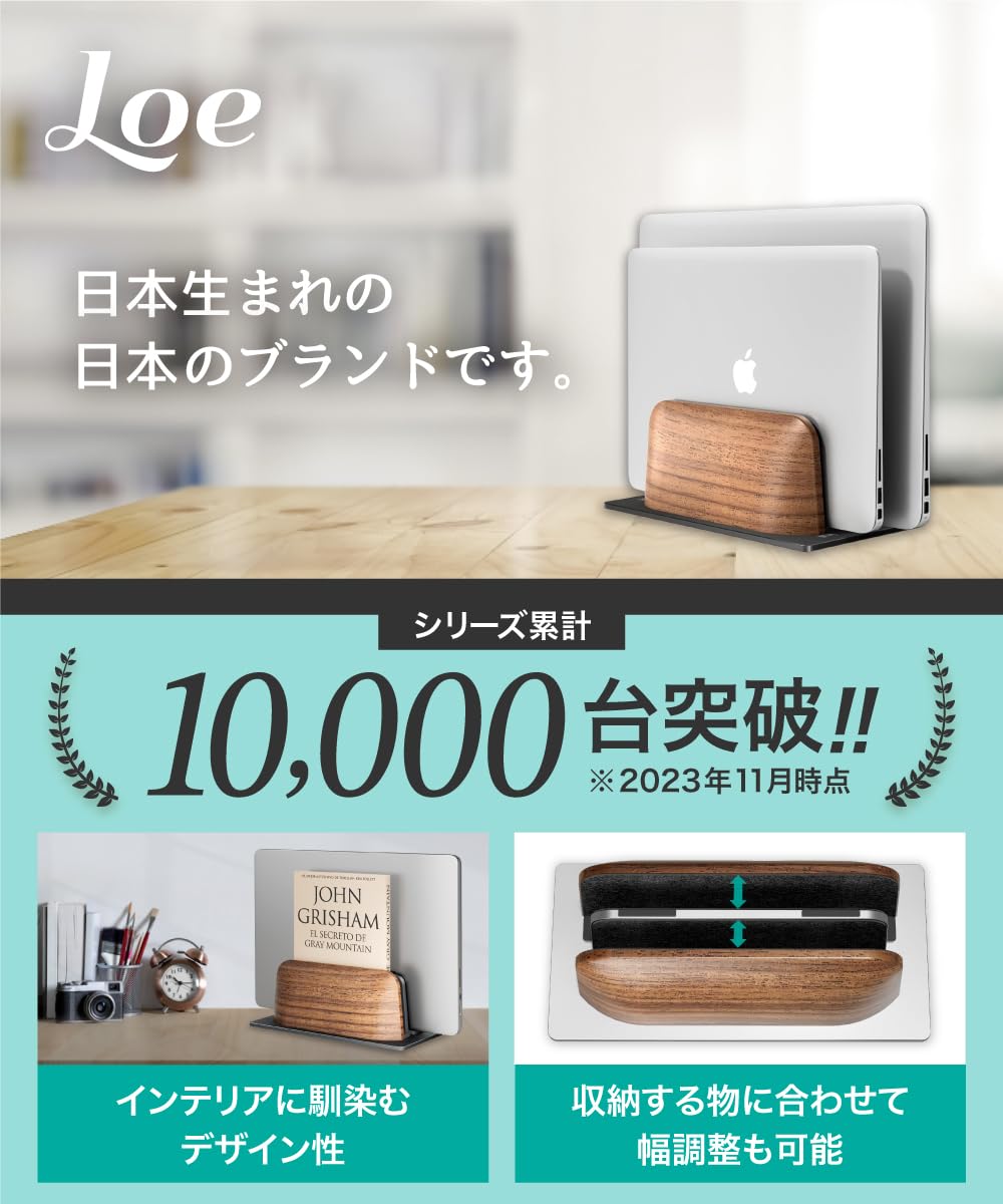 LOE(ロエ) ノートパソコン スタンド 縦置き 収納ホルダー 2台対応 幅調節可 木製デザイン アルミ合金 全機種対応 MacBook/Surface/iPad 省スペース PCスタンド (ブラック)