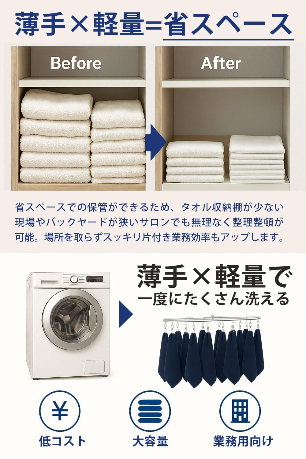 ? 【 薄手で速乾性が高くコンパクトな業務用タオル 】 ■ 薄手で速乾性が高く、一度に沢山洗濯ができ収納もコンパクト。エステサロン・整体院・マッサージ・リラクゼーションサロン等に最適な業務用タオル ■ 薄手で速乾性が高く、更に吸水力が高く生地がしっかりしているので、業務用タオルとして最も適しております。