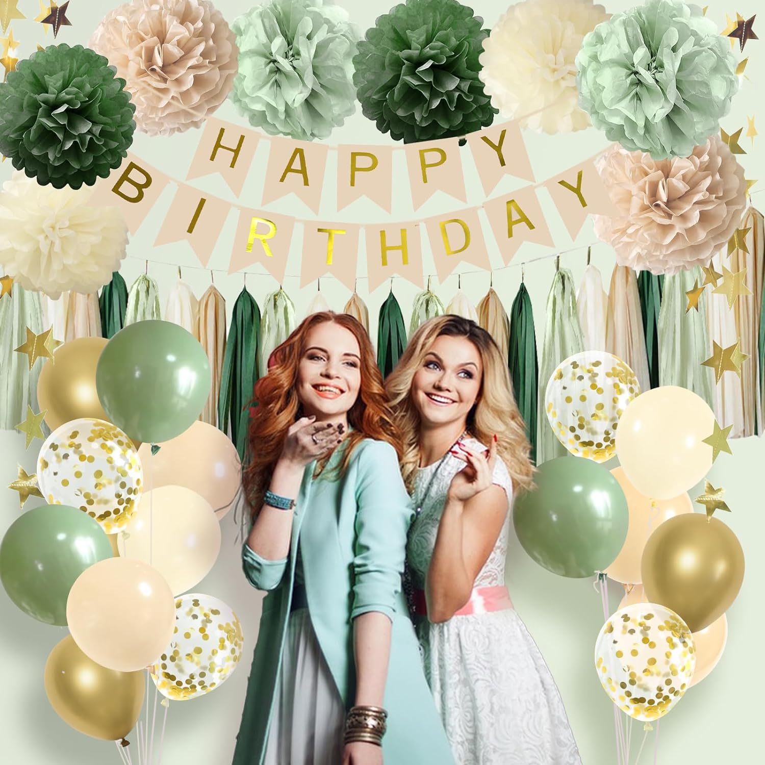 【誕生日 飾り付け セット内容 】私たちの52個の誕生日装飾セットには、Happy Birthday バナー×1個、グリーン風船x5個、紙吹雪バルーンx4個、ホワイトラテックス風船x4個、ヌードカラー風船x4個、ゴールド風船x4個、星型花輪x1セット、ペーパーフラワーx8個、フリンジパーティー花輪x20枚。
