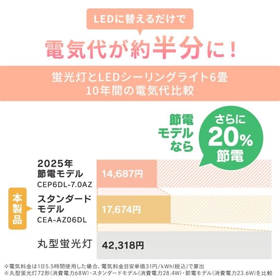 【節約】家の照明をLEDに変えるだけで効率的な節電に。蛍光灯とLEDシーリングライト10年間の電気代は、24,644円もお得になる。