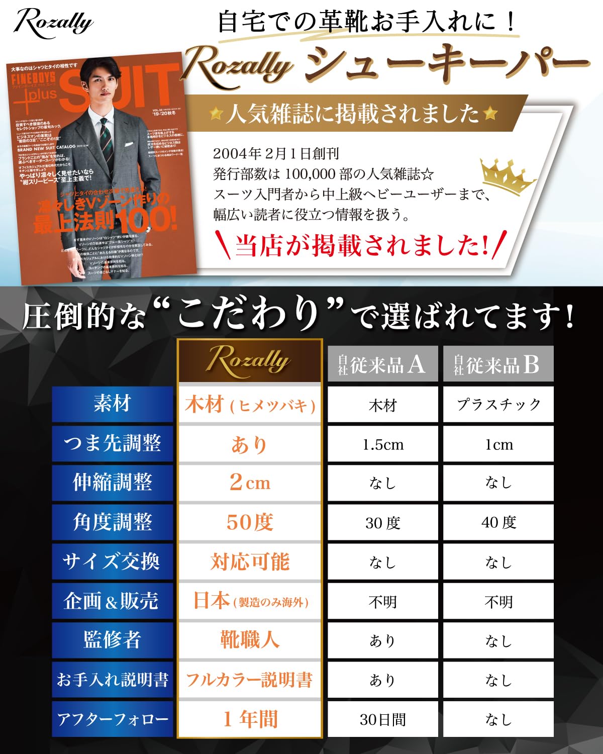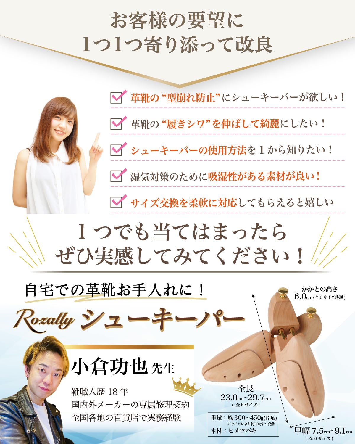 【靴職人が監修】 Rozally シューキーパー がついに正式販売開始。 革靴 や ビジネスシューズ の 型崩れ防止 に 木製 の シューズキーパー が欲しい…という声から生まれた 吸湿 & 防臭 にこだわりのシューキーパーです。 革靴 は履いているとどんどん 型崩れ していくため定期的に シューキーパー (シューツリー) を使用して”シワ伸ばし”をすることで長持ちに繋がります。 企画&設計では【靴職人】の先生からアドバイスをもらい、初心者でも分かりやすい”シューケア”の取扱説明書を添えて製品化しました。