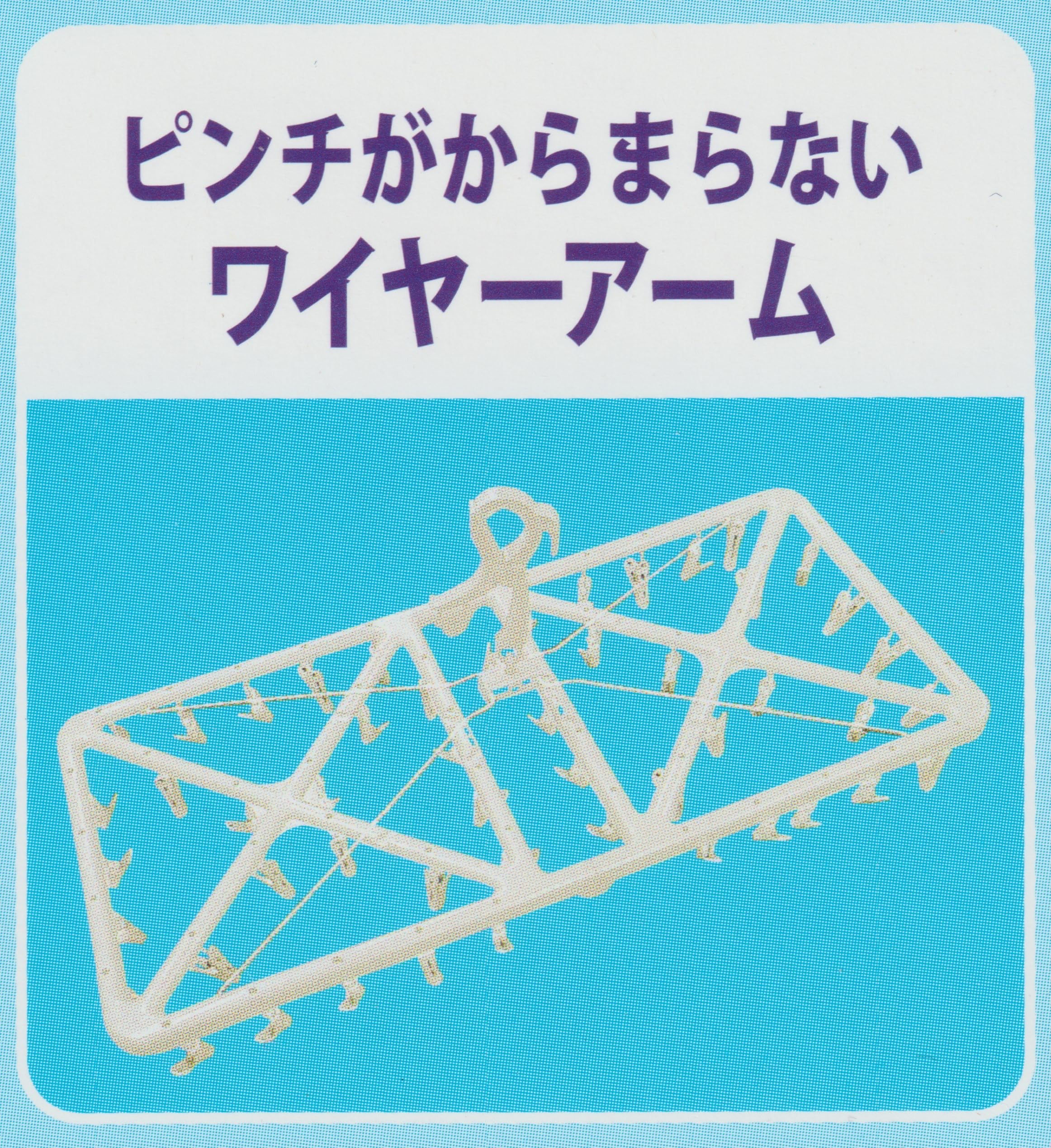 開閉がスムーズなワイヤー吊り下げです。室内干しに便利なフックつきです。吊り下げ部分にワイヤーを採用していますので、開閉がスムーズです ピンチ52個付 室内干しに便利なフック付きです 使用しないときは折りたたんで竿にすっきり掛けられる下折れ式フレーム 青と白の2個セット