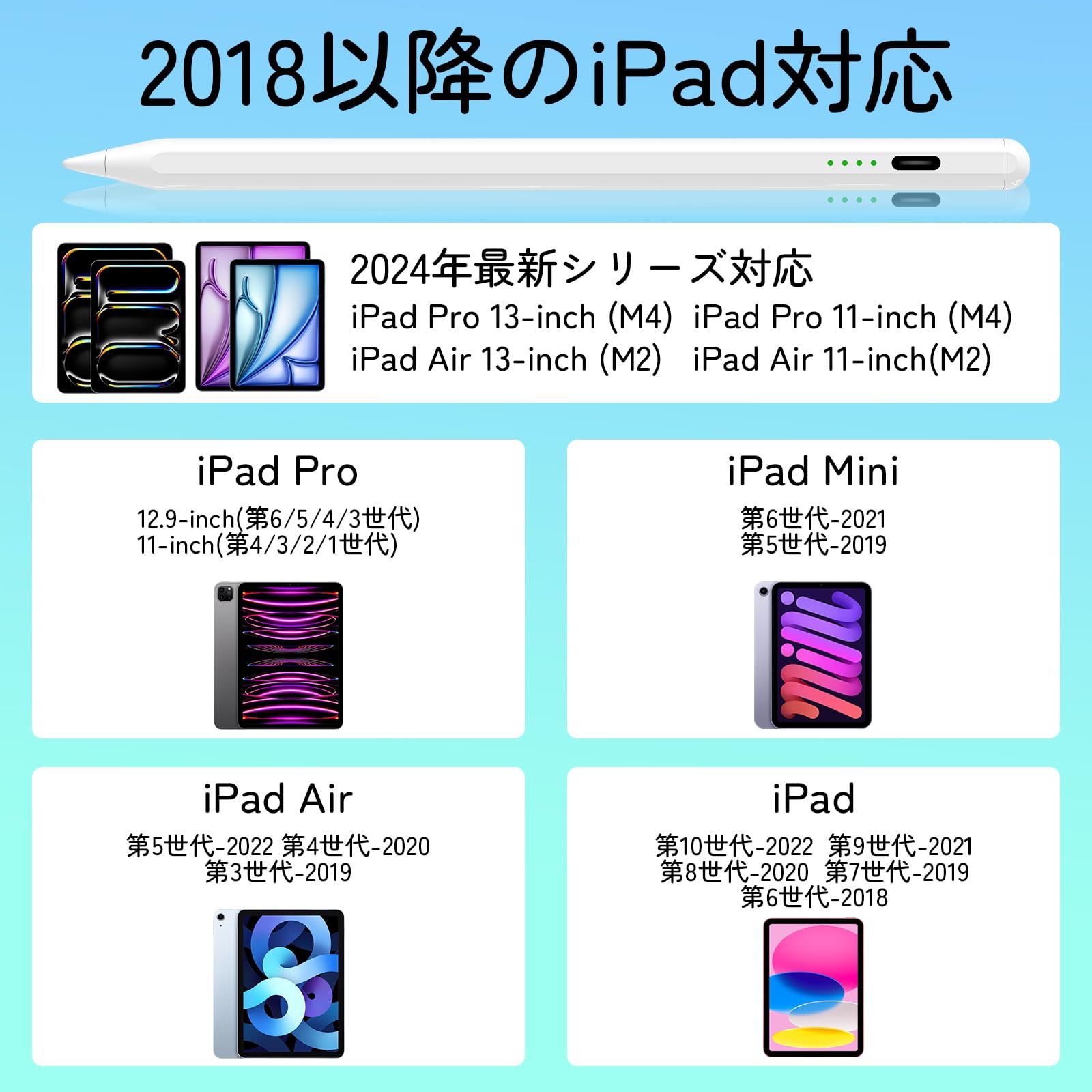 【2018年以降iPad専用タッチペン】ipad専用タッチペンの互換性が高くて、2018年以降iPadにすべて対応可能です:iPad (第6/7/8/9/10世代)、iPad Pro 12.9 (第3/4/5/6世代) 、iPad Pro 11(第1/2/3/4/M4世代) 、iPad Pro 13(第M4世代)、iPad Air (第3/4/5/M2世代) 、iPad mini (第5/6世代)