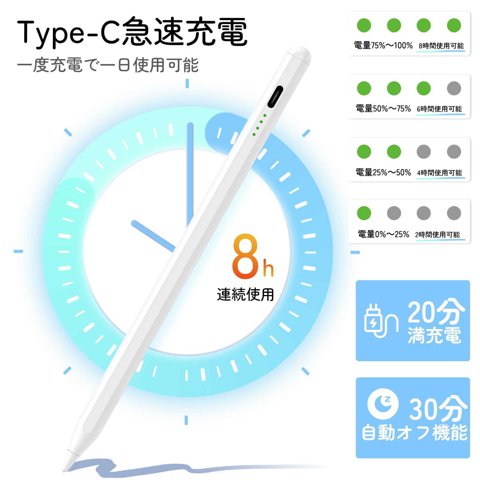 【超高速充電・一日連続使用】iPadタッチペンはUSB-C急速充電式で、20分間でフル充電ができ、大容量バッテリは8時間の連続使用が可能です。一度充電すれば一日の使用に対応できます。30分間放置すると自動で電源がOFFになり、バッテリーの節約に役立ちます。4つのLED電量表示により、電量状況が一目瞭然で、充電を忘れる心配なしです。