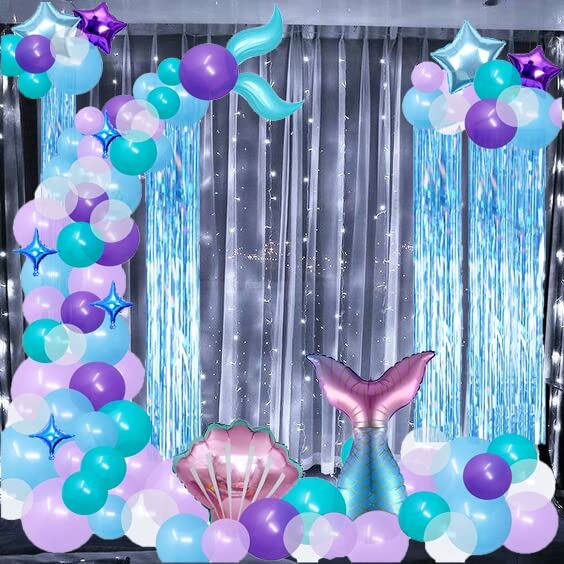 【商品セット内容】①アルミバルーン×10個(マーメイドテイル*1、貝殻*1、四隅星*4、五芒星*4) ②マーメイドテイルバルーン×2個 ③5インチゴム風船×19個(薄紫*5、青*5、紫*3、緑*3、透明*3) ④12インチゴム風船×25個(透明*5、紫*5、緑*5、薄紫*5、青*5) ⑤18インチゴム風船×4個(薄紫*2、青*2) ⑥カーテン(1×2m) ⑦リボン ⑧バルーンチェーン