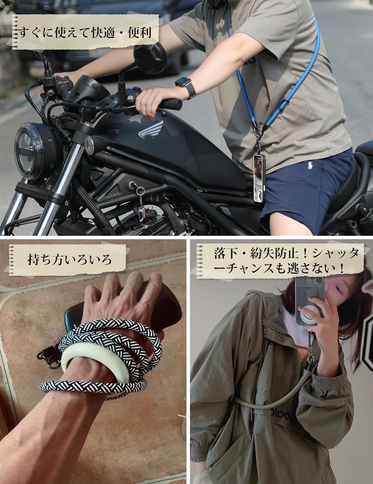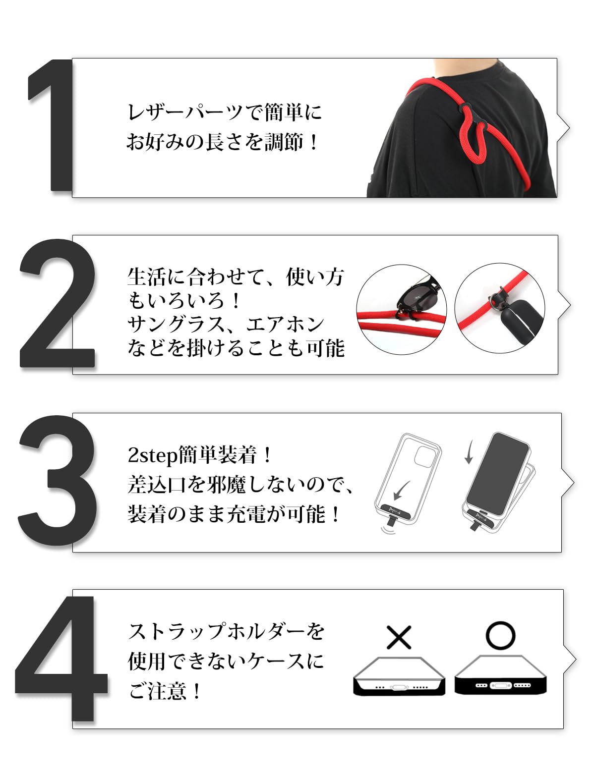 ★【製品仕様】ネックストラップ最長約127cm、直径約1cm、重量約80g。首掛けだけでなく、斜め掛けも可能です。幅は人間工学に基づいたデザインで、太すぎず細すぎず、軽量で快適、首を楽にします。付属のストラップホルダーはわずか0.5mmで、充電に邪魔しません。それにストラップホルダーの幅は45mmだけですので、全機種対応できます。