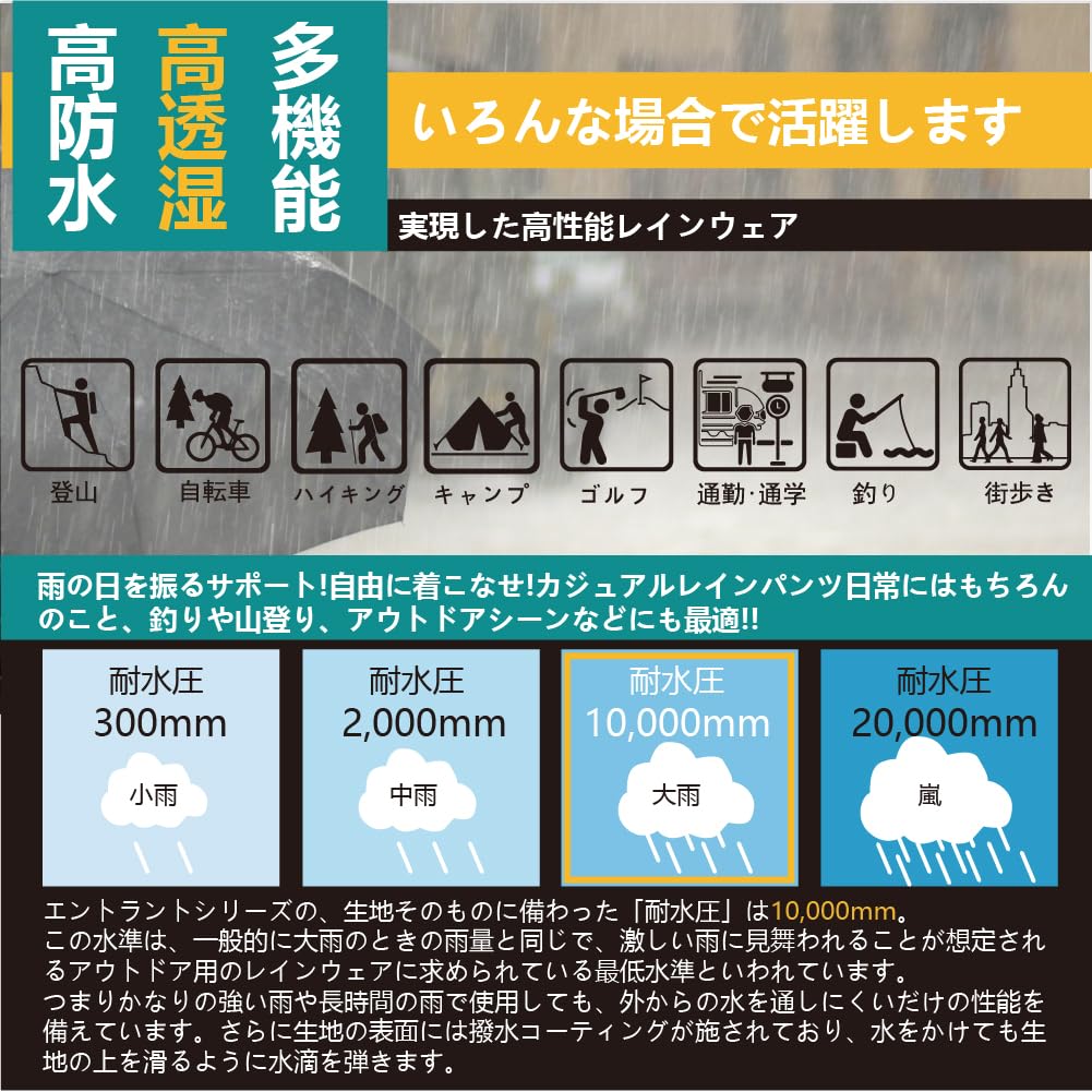 [防水透湿素材使用]レインスーツは防水素材として実績の高い耐水圧10,000mm透湿度5,000g/m2・24hrのTPUラミネート生地を採用、生地の裏面にはシームテープ加工を施し、水が入ってくるのを防ぐ、強い水圧をかけると表面が濡れたように見えますが、水が染込むことはございません。外からの浸水を防ぎながら、衣服内の湿気を排出する透湿性を搭載、長時間の着用でもムレにくい設計です。