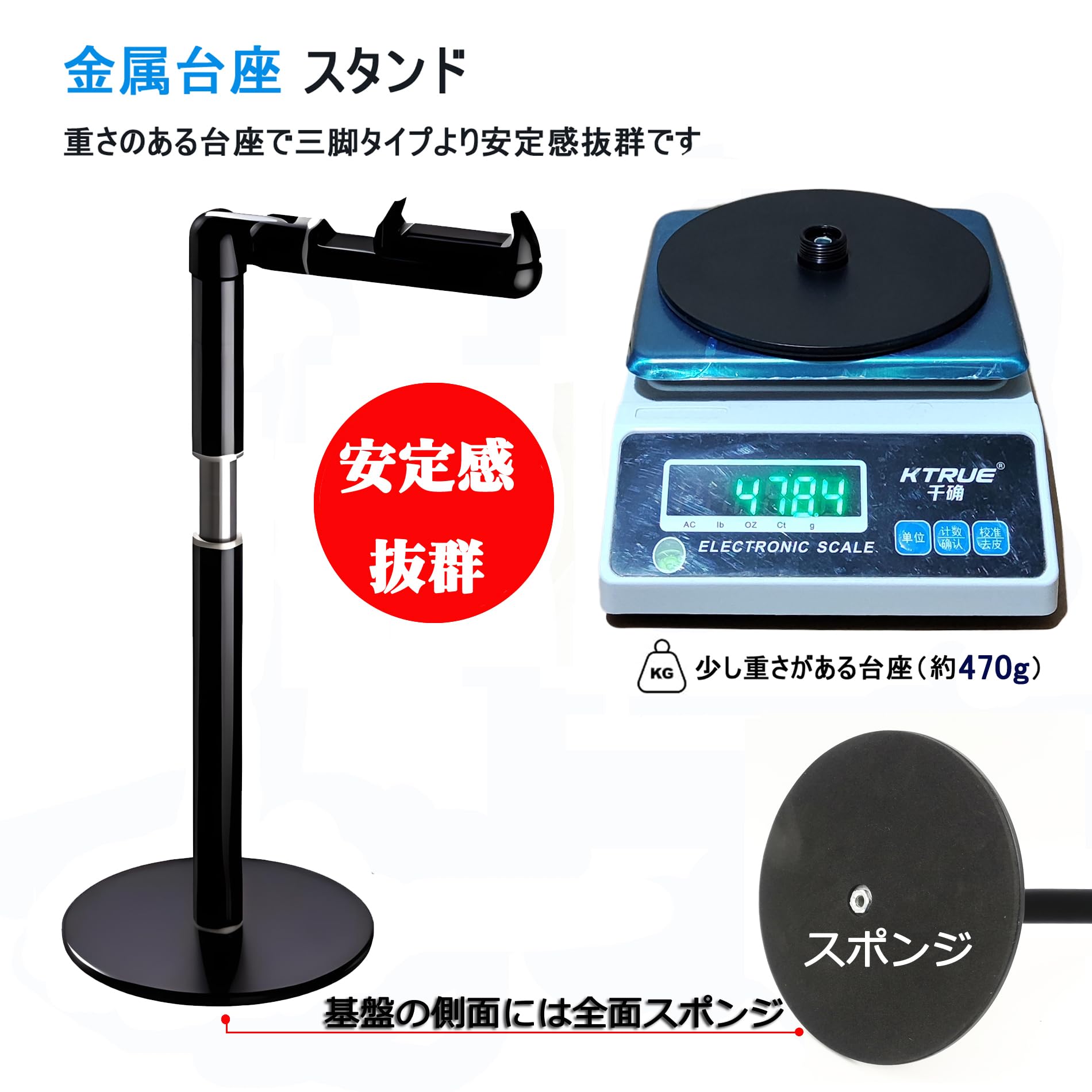 【耐久性と強度に優れる】金属製の柱と重い台座(直径:約160mm、重量:約470g)を使用しており、ずっしりした重量級の安定感は抜群のスマホ撮影用スタンドです。料理動画、お絵描きの動画、DIYなど作業中の撮影がブレや揺れなどなくなって、スマホ 動画撮影 便利グッズです。更に台座の底には傷防止用EVA素材の滑り止めマット(クッション)が付いているので、デスクを傷つけないため安心感があります。