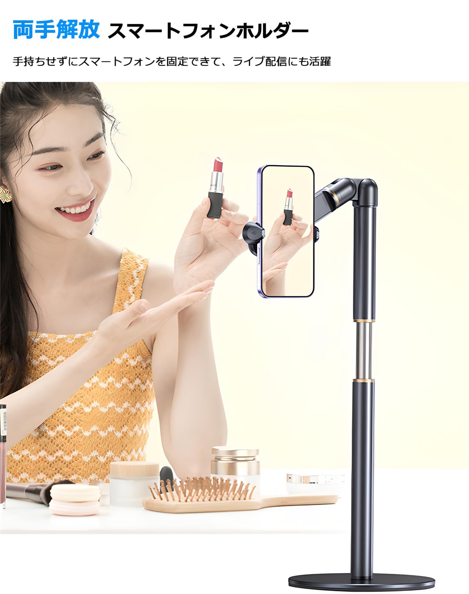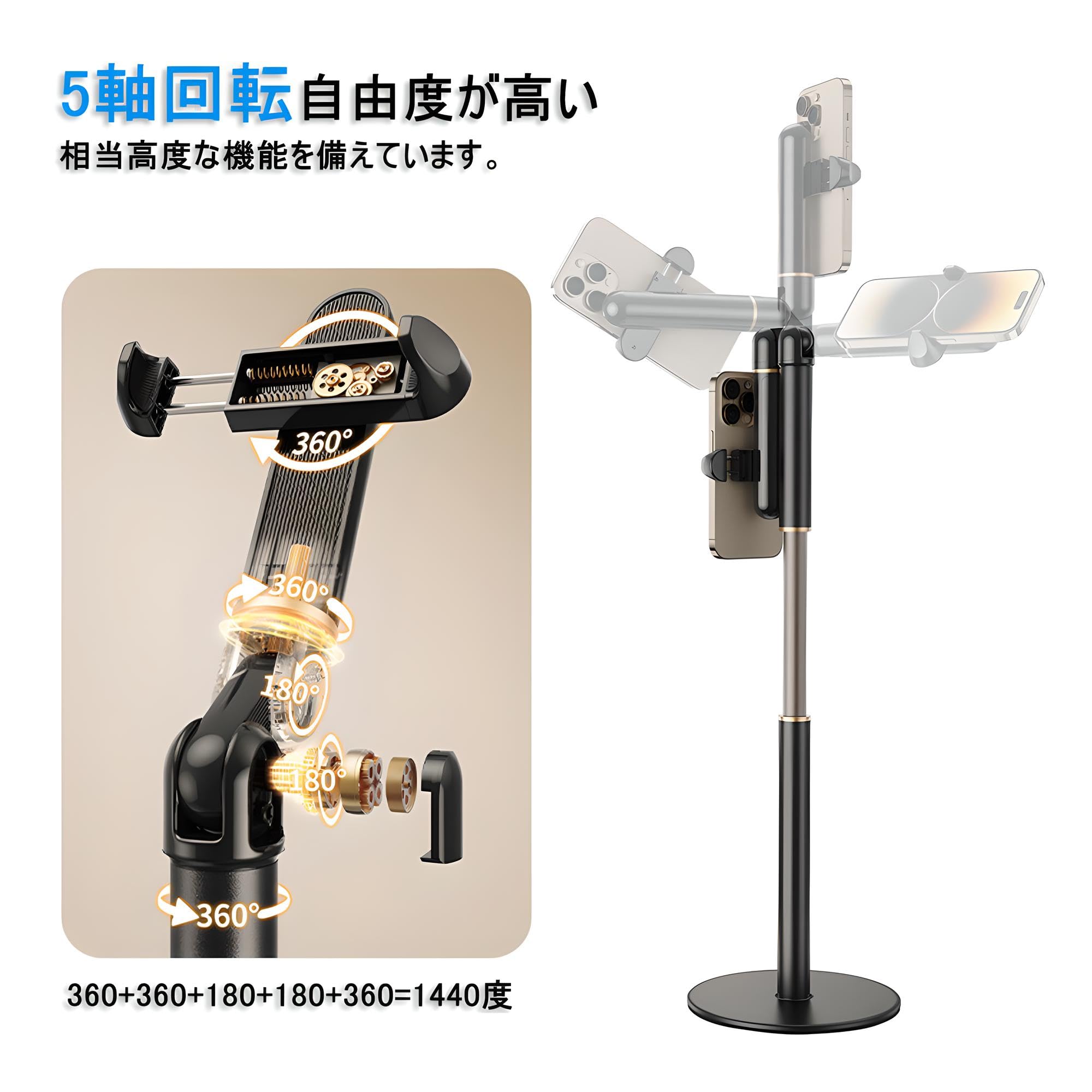 【5軸回転・伸縮可能自由度が高い】この卓上スマホ スタンドはデスクトップ置きながら水平・高さの調整、水平・垂直回転、5軸回転と相当高度な機能を備えています。 様々な被写体やアングルに合わせて微妙にスマホの位置を調整でき、クリエイティブなアイディアを形にしやすくなります。