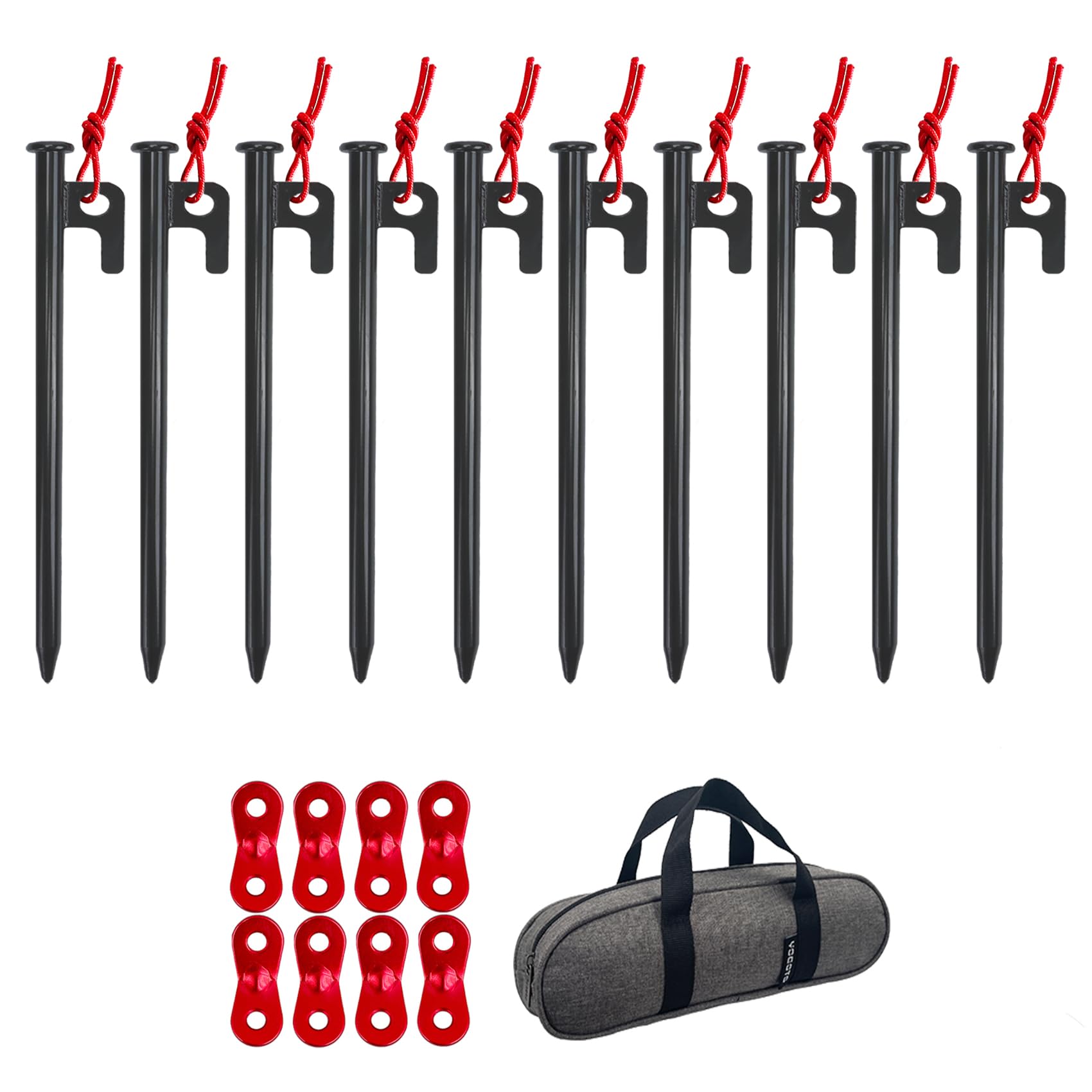 【多用途なセット内容】20cmのスチールペグが10本で提供され、ソロキャンプから家族でのアウトドア、イベント設営に至るまで幅広い用途に対応する。