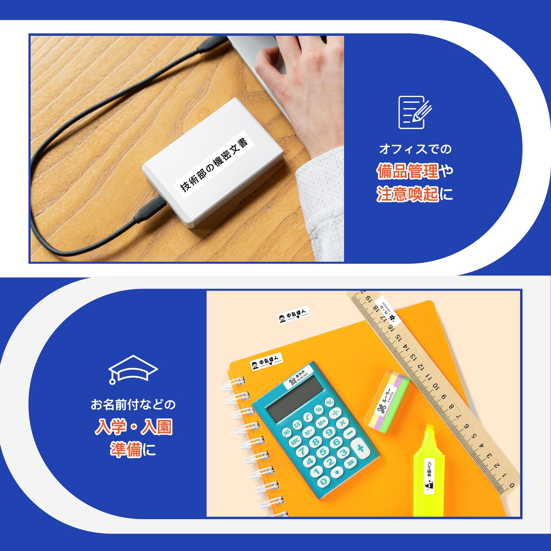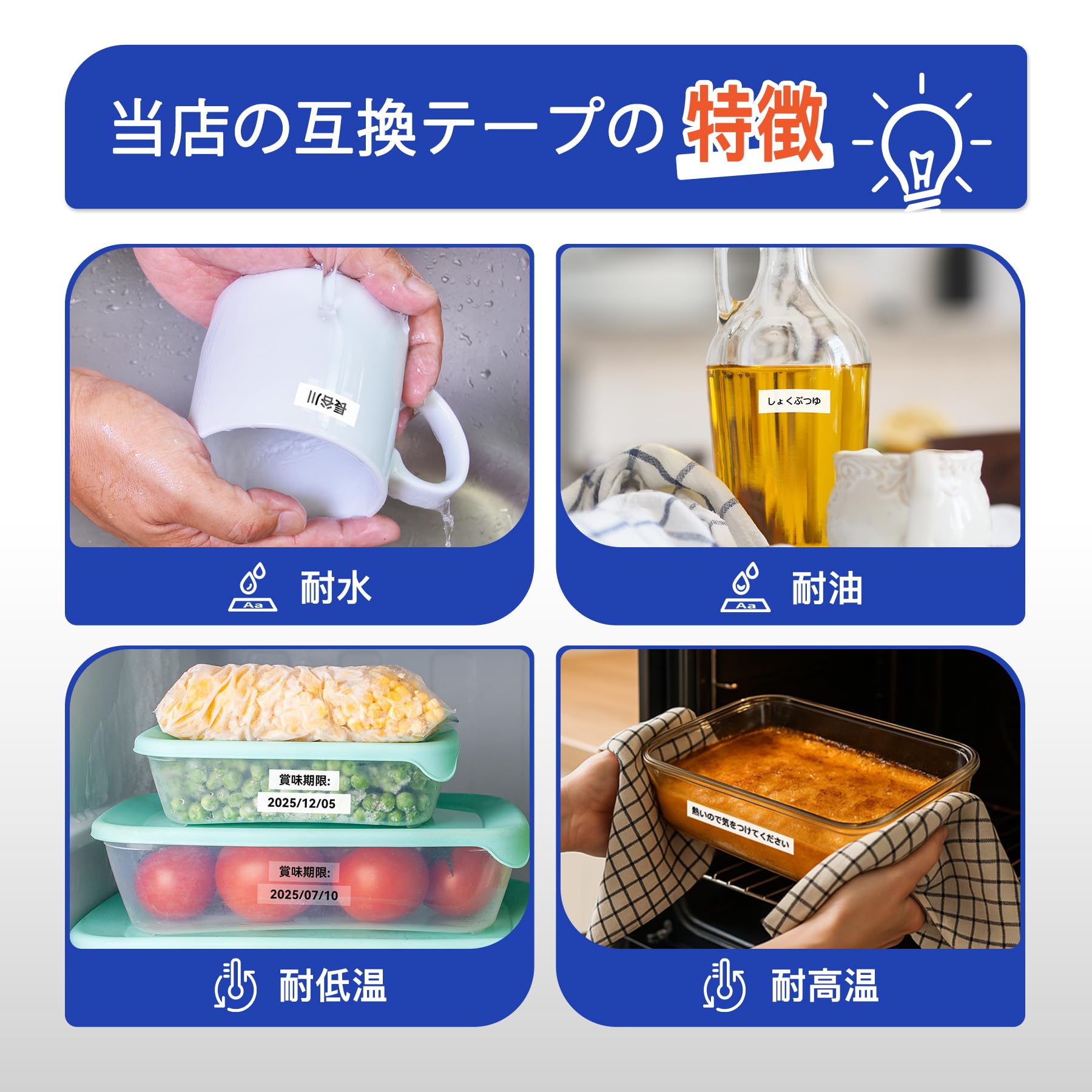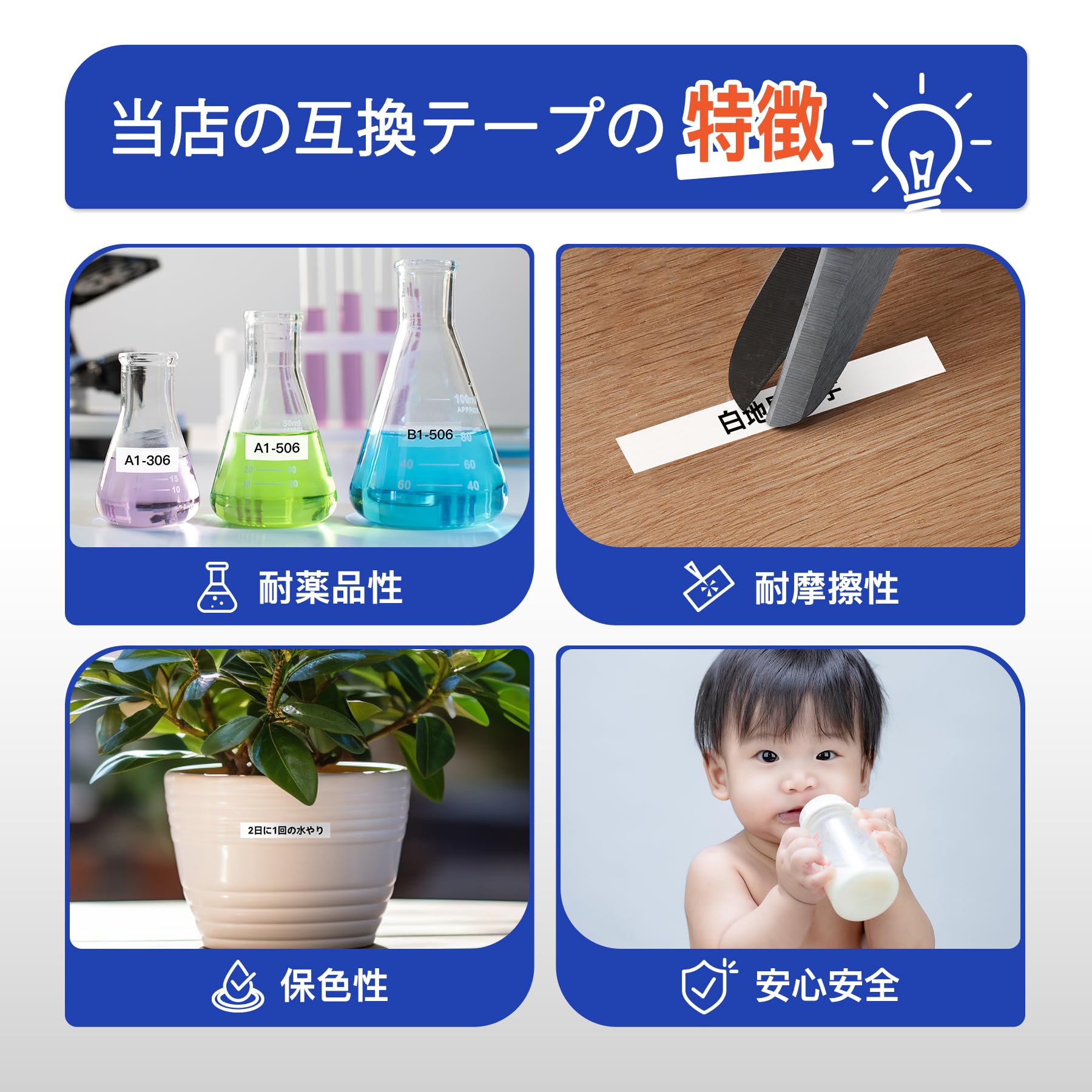 【メリット】:印刷面の裏側中央に切れ目が入っており、剥がしやすく、使い勝手が良いです。耐水性・耐摩耗性に優れており、色褪せにくいです。オフィス用品、寝室、ウォークインクローゼット、台所用品、学校、病院、店舗など幅広い場所で活用できます。