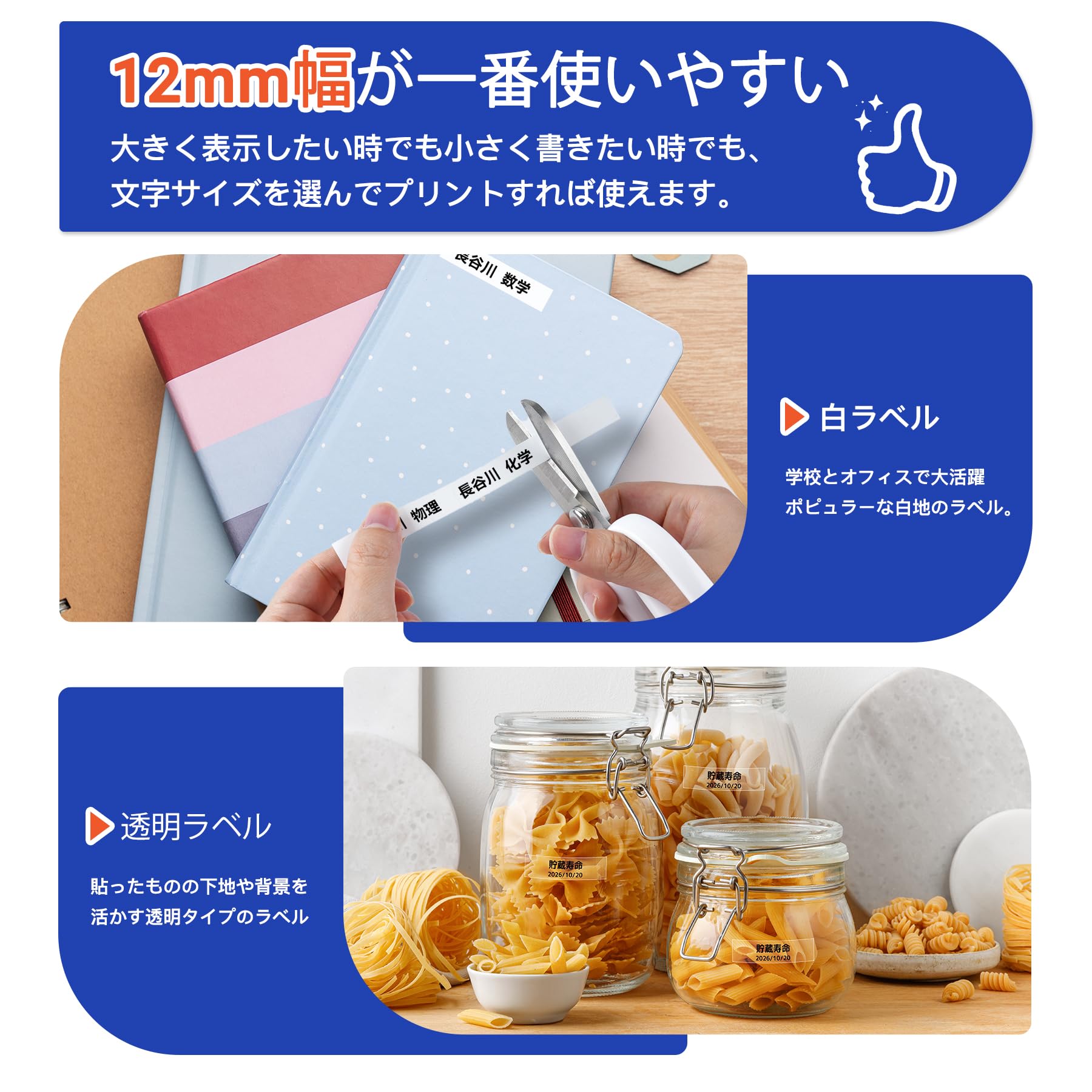 【規格】:サイズ/幅 12 mm × 長さ 8 m、色/白地黒文字x2個、透明地黒文字x1個。