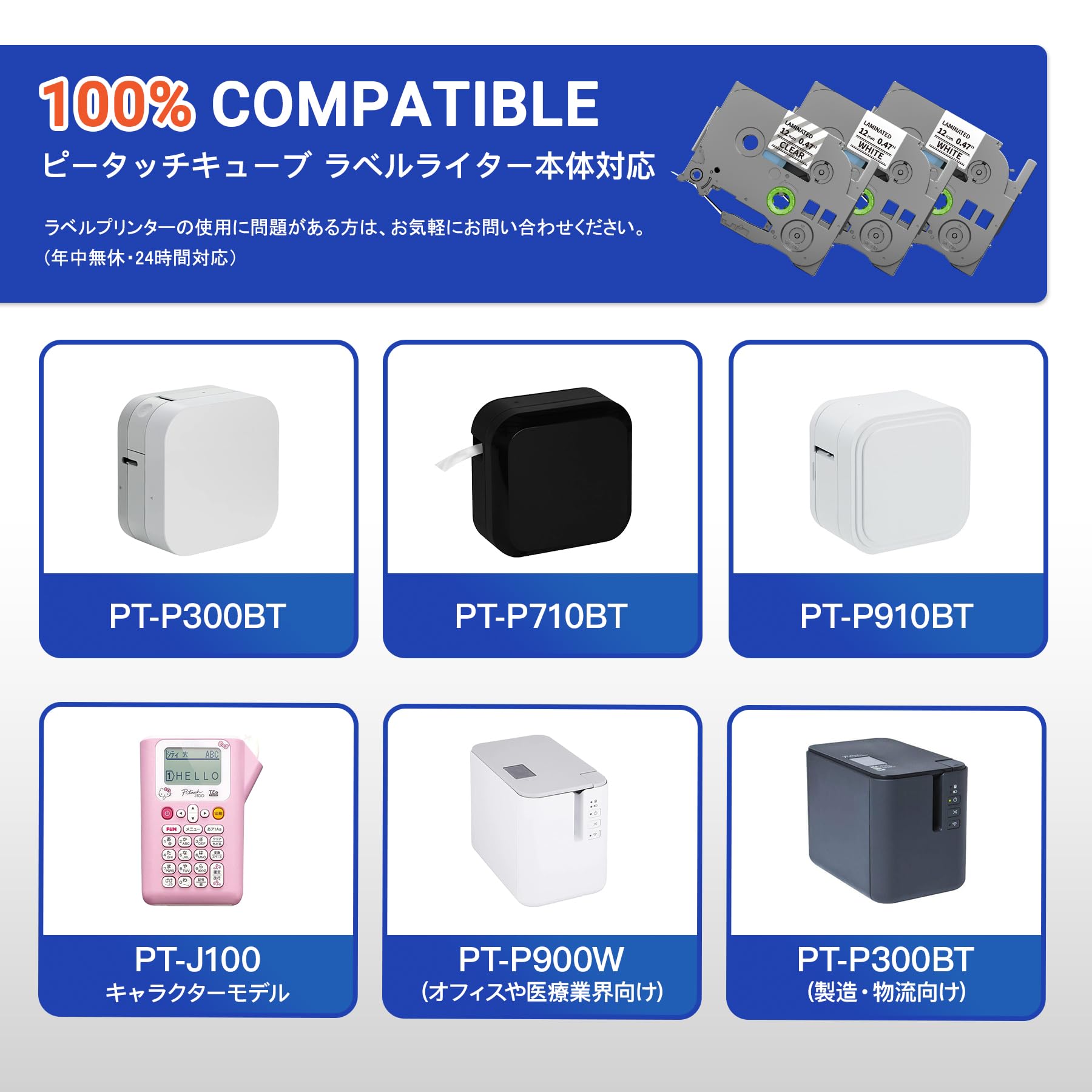 【ラベルライター対応機種】:PT-P300BT(新品 PT-P300BTLT)、PT-P710BT、PT-P910BT、P-Touch (新品 PT-J100CL) PT-J100W、PT-J100P、PT-J100MB、PT-J100MR、PT-J100SL、PT-J100KW、PT-190P、PT-190S、PT-190MB、PT-190PO、PT-190SL、PT-190KB、PT-12、PT-2730、PT-18R、PT-18N、PT-P700、PT750W、PT-9700PC、PT-170、PT-160、PT-120、PT-180、PT-250BG、PT-250BY、PT-2500PC、PT-1500PC、PT-PC、PT-240、PT-24、PT-9500PC、PT-9300PC、PT-9200PC、PT-D210 など、その他のブラザーピータッチラベルライター機種。