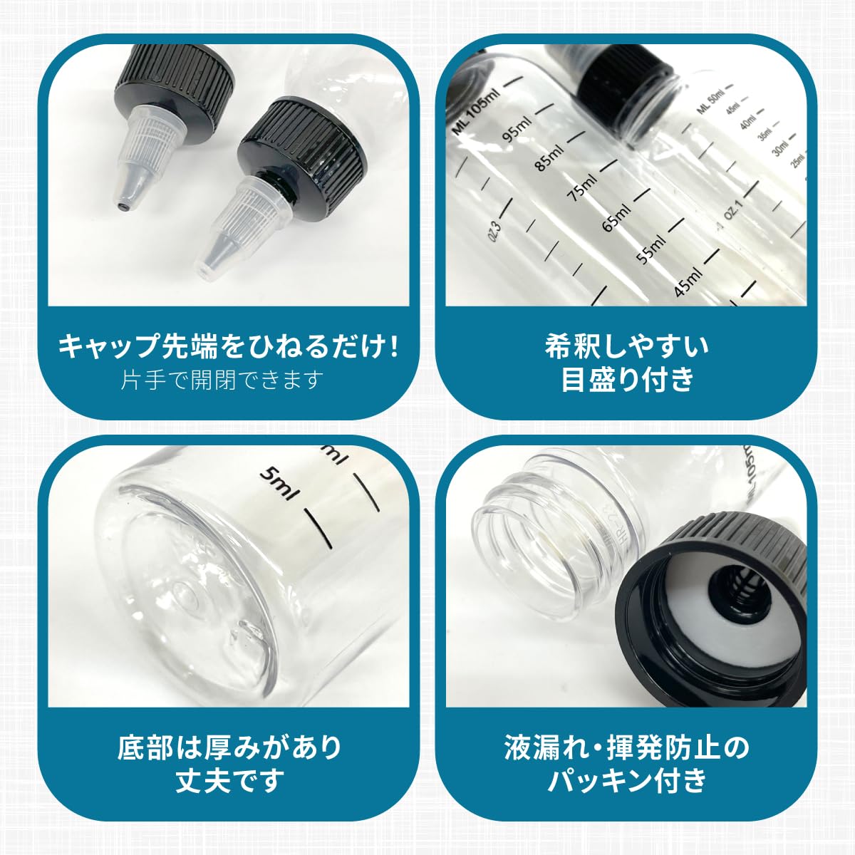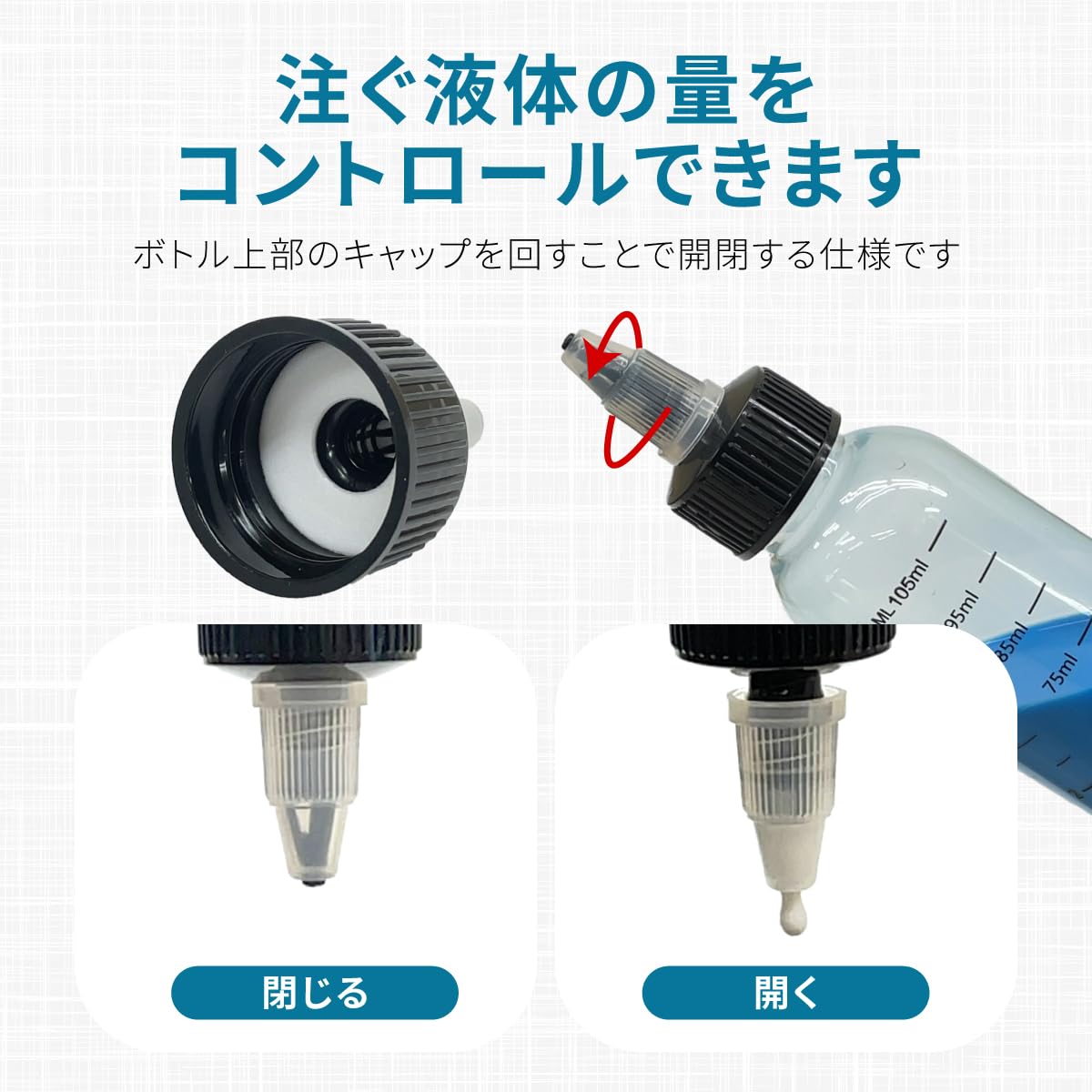 【目盛り付き】ボトルの表面には、5mlずつに目盛りが刻まれており、注入量を確認しながらの作業に便利です。ボトルの本体が透明なので、中の液体の量がはっきりとわかります。