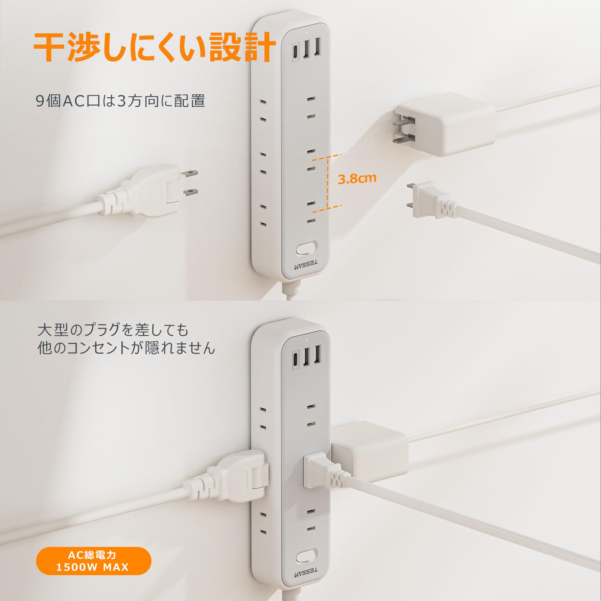 「干渉しづらいデザイン」:ACコンセントを3方向に分配して、どちら側からも気軽にケーブルを挿すことができます。ACアダプタが同時挿せでも互いに干渉しません。AC出力は最大1500W(125V/15A)、ほとんどの家電製品が使用可能!コンパクトな設計の上に機能性もよく実現します!