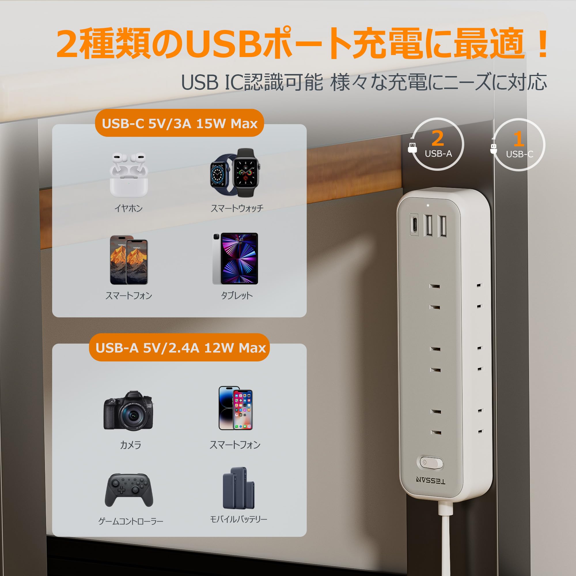 「一台12役・電源タップ」コンセント差込口9口に加えUSB-Cポート1つとUSB-Aポート2つを搭載します。ACコンセントで複数の家電を接続しながら、USBポートでお使いのUSB機器を充電できます。家やオフィスに複数の電子機器に充電したい場合、これ一つのusb電源タップがあれば、十分です。