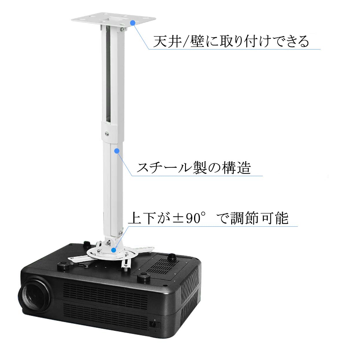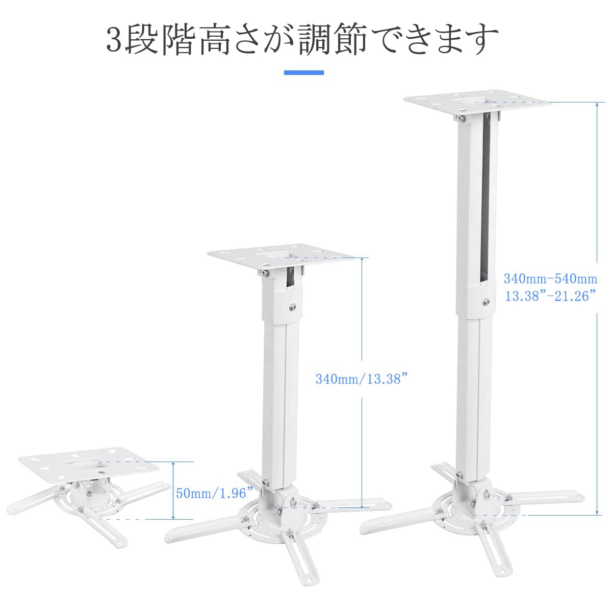 【商品仕様】プロジェクター汎用の取付金具であり、穴から穴への距離は70-300mm、重さは13.6kg以下のプロジェクターには全部対応出来ます。取り付け穴が三つと四つのプロジェクターには全部使えます。さまざまなブランドのプロジェクタを幅広くサポートします。一回設定できたらあとの調節は不要で、スイッチオンだけでくっきりした映像を投影できます。?ポールの伸縮可能な長さ:50-340-540mm