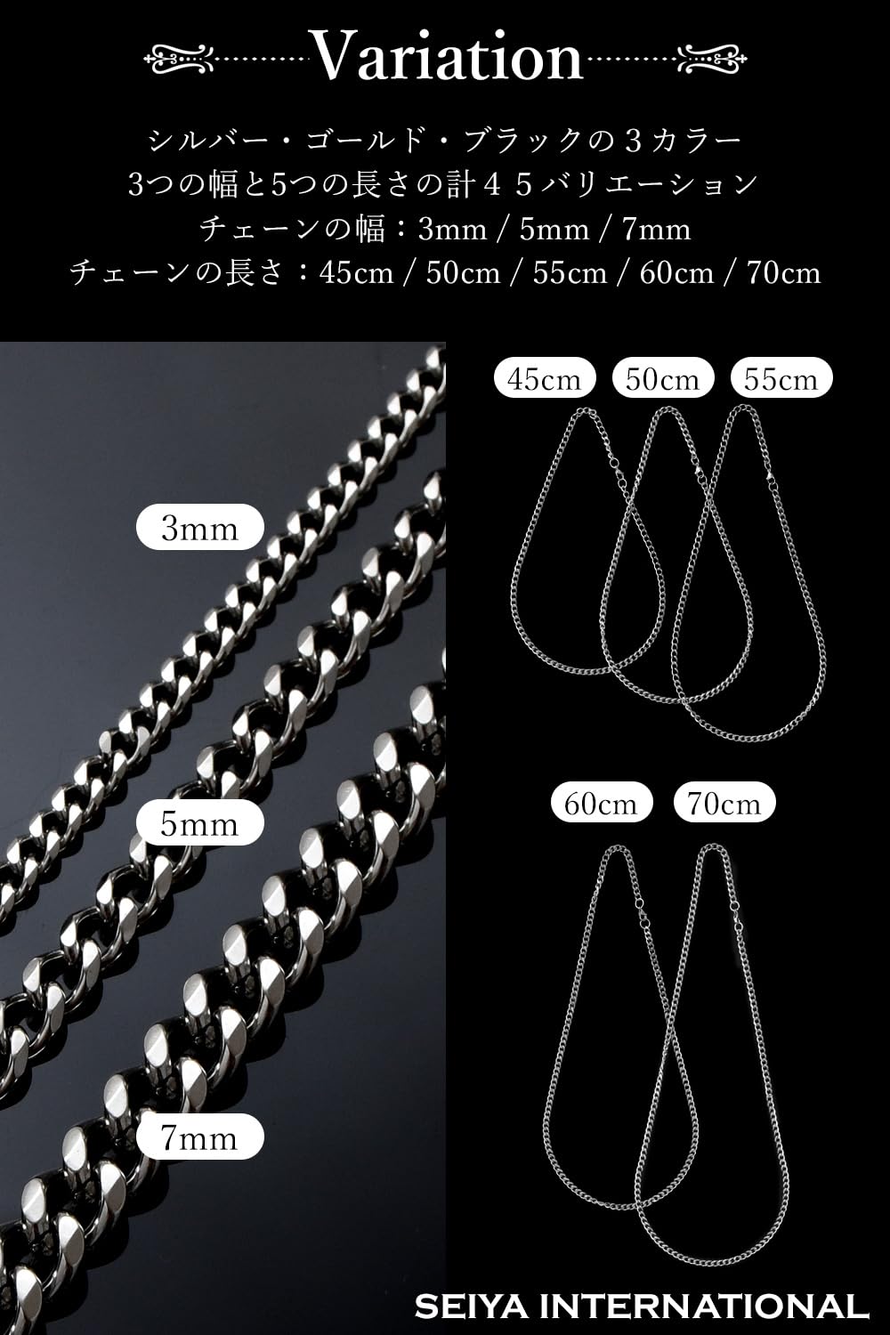 【選べるカラー・サイズ】 シルバー ゴールド ブラック 幅 3mm・5mm・7mm チェーンの長さ45cm・50cm・55cm・60cm・70cmのそれぞれ計45種類ご用意しております。細めのチェーンから太めのチェーンと長さを選べるため、きっとあなたのお気に入りが見つかります。