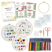 【すぐ始められるオールインワンキット】布地3枚、刺しゅう糸22束、刺しゅう針9本、刺繍枠、ハサミ、糸通し、糸抜き、と必要な道具がすべてがセットに。