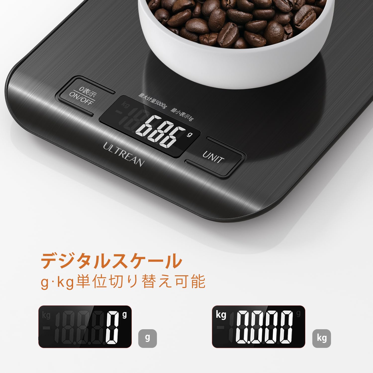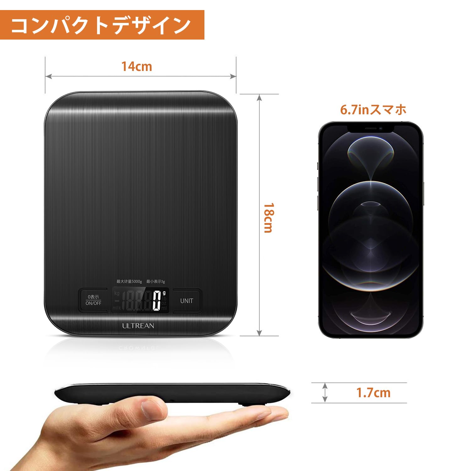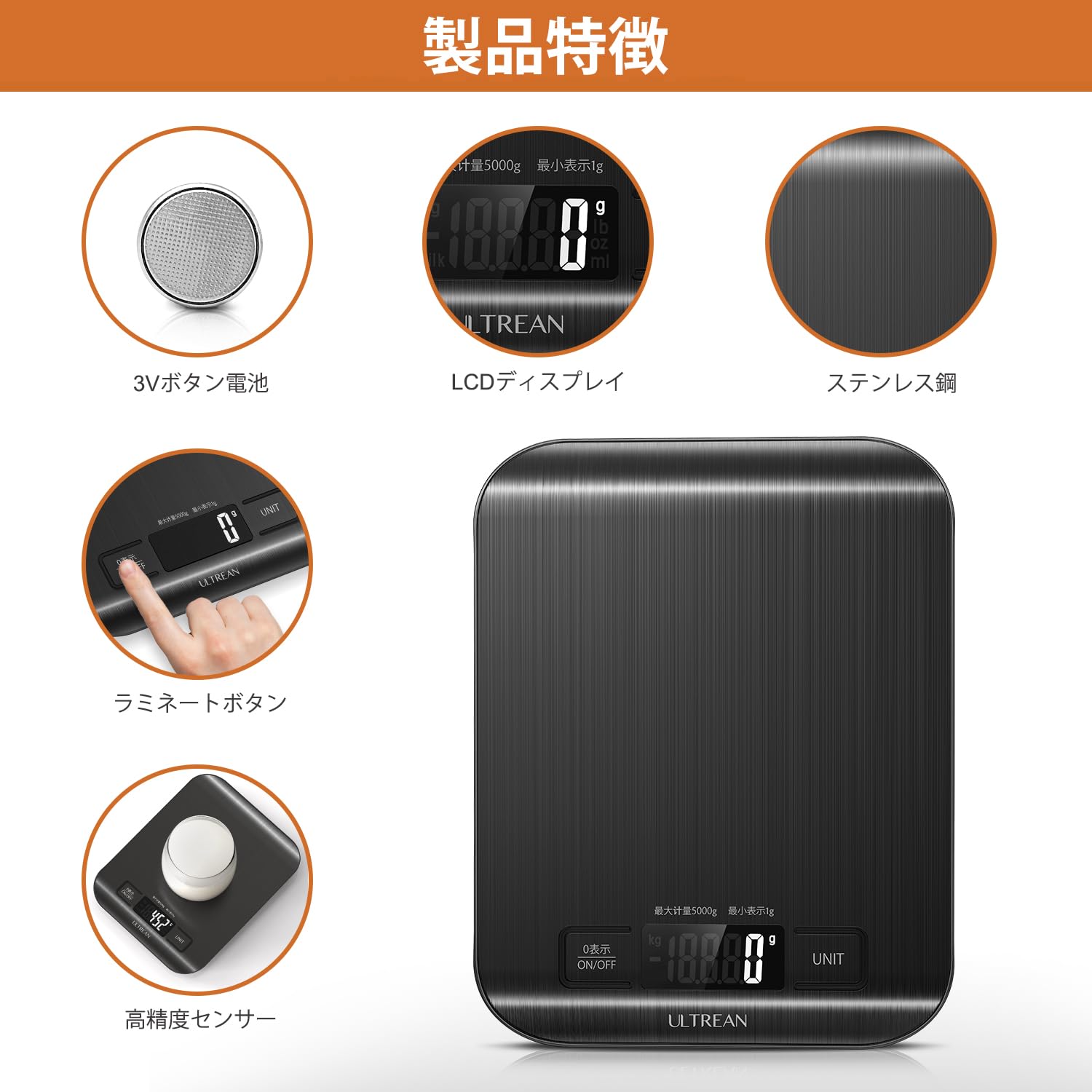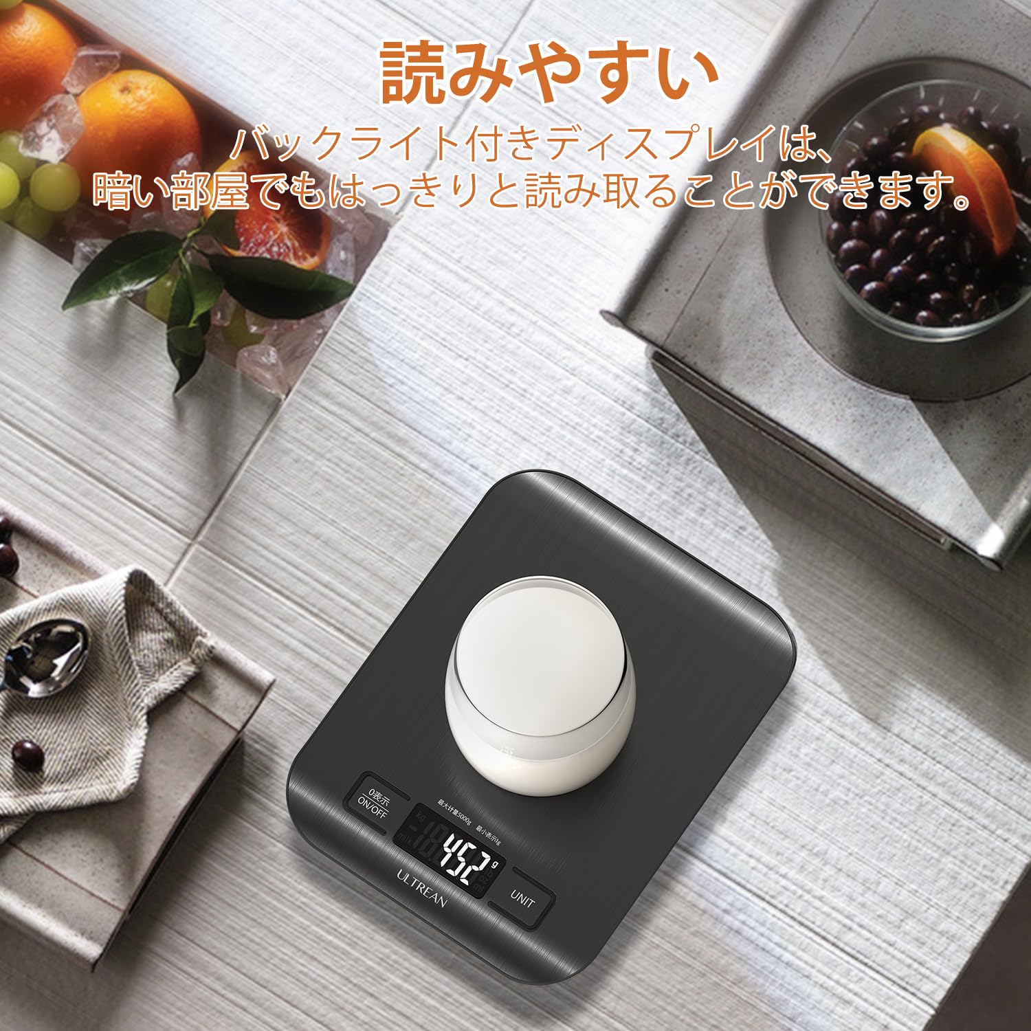 Ultrean キッチンスケール 5kg デジタル はかり 表面防水 1g単位 LCD ディスプレイ 電子 測り 計量器 料理 調理 お菓子作り 薄い 風袋引き機能(電池付属)