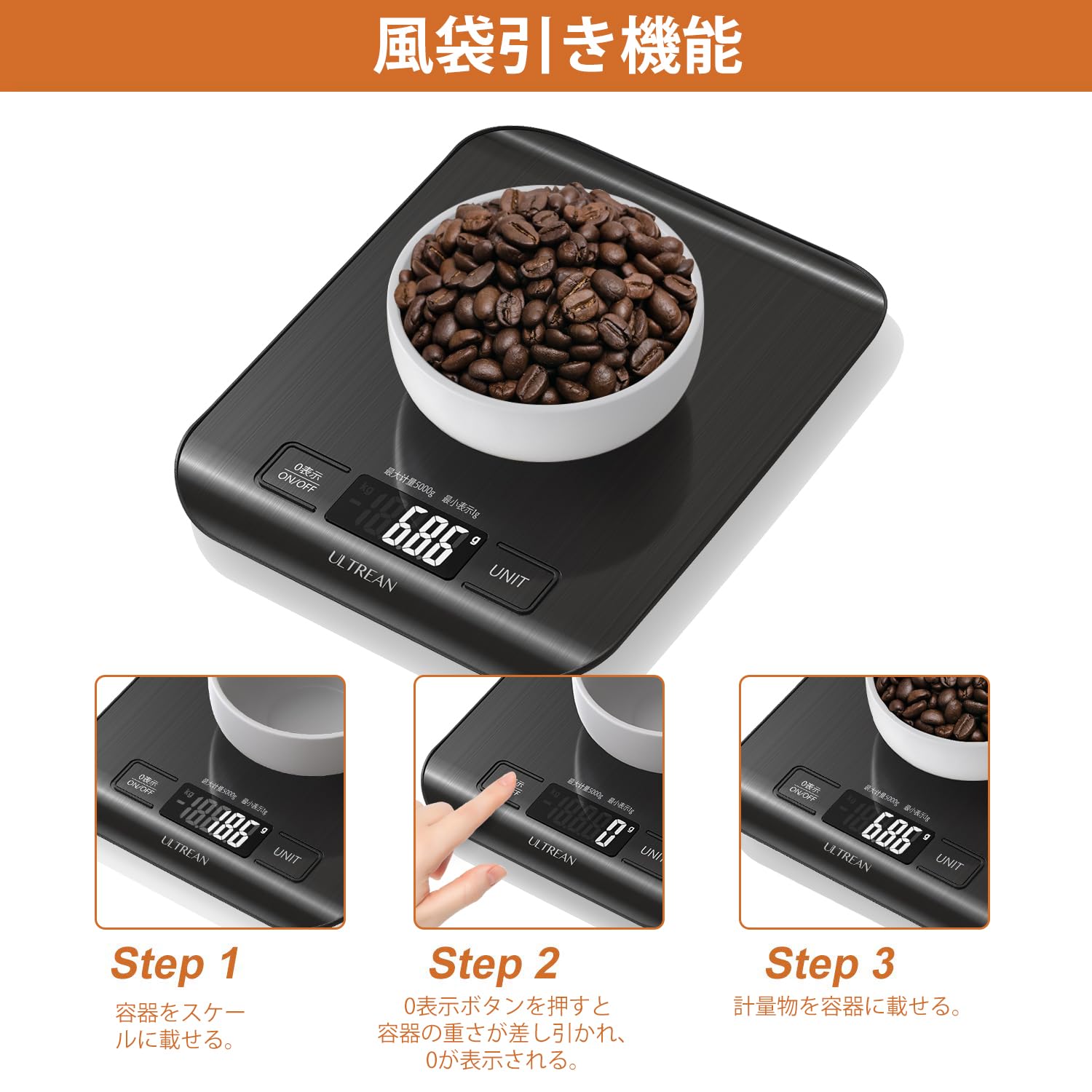 【多機能】Ultrean電子はかりは風袋引き機能、単位切替機能、自動オフ、校正機能、重量超過提示(ERR)、低電量(LO)提示など機能が付いています。デジタル秤の底部の四隅のシリコンゴムによって滑りを防止でき、計りの安定性が十分にされています。この重量計はマイナス白デジタル表示を備えているので、照明が悪い環境でも読みやすい。