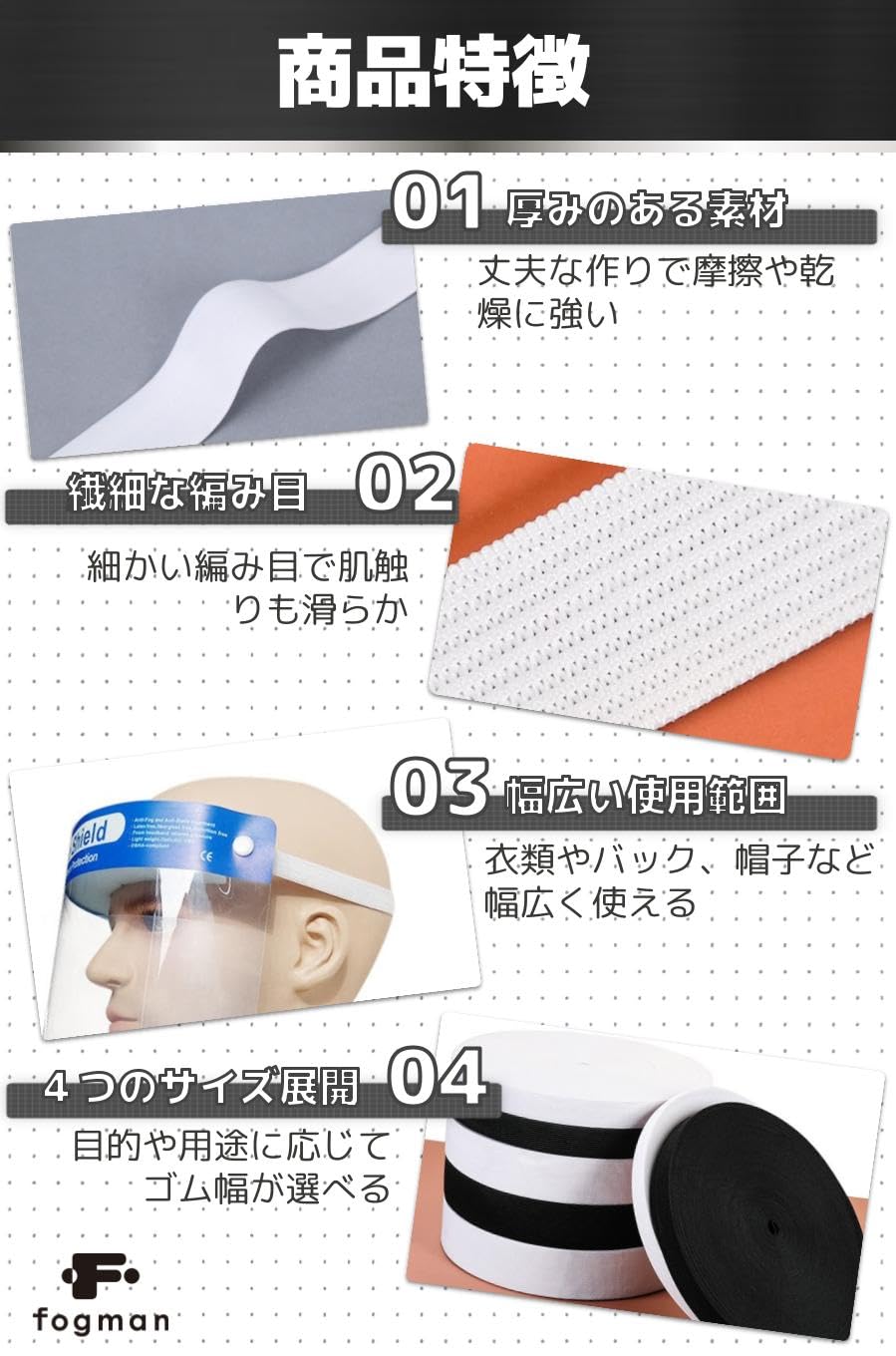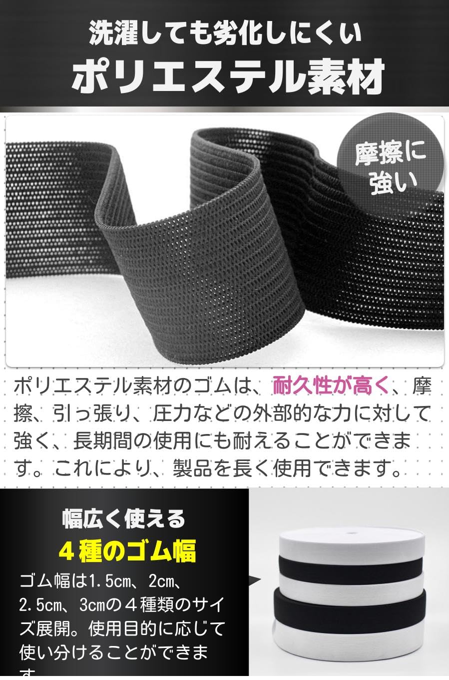 【4種のゴム幅】ゴム幅は1.5cm、2cm、2.5cm、3cmの4種類のサイズ展開。使用目的に応じて使い分けることができます。