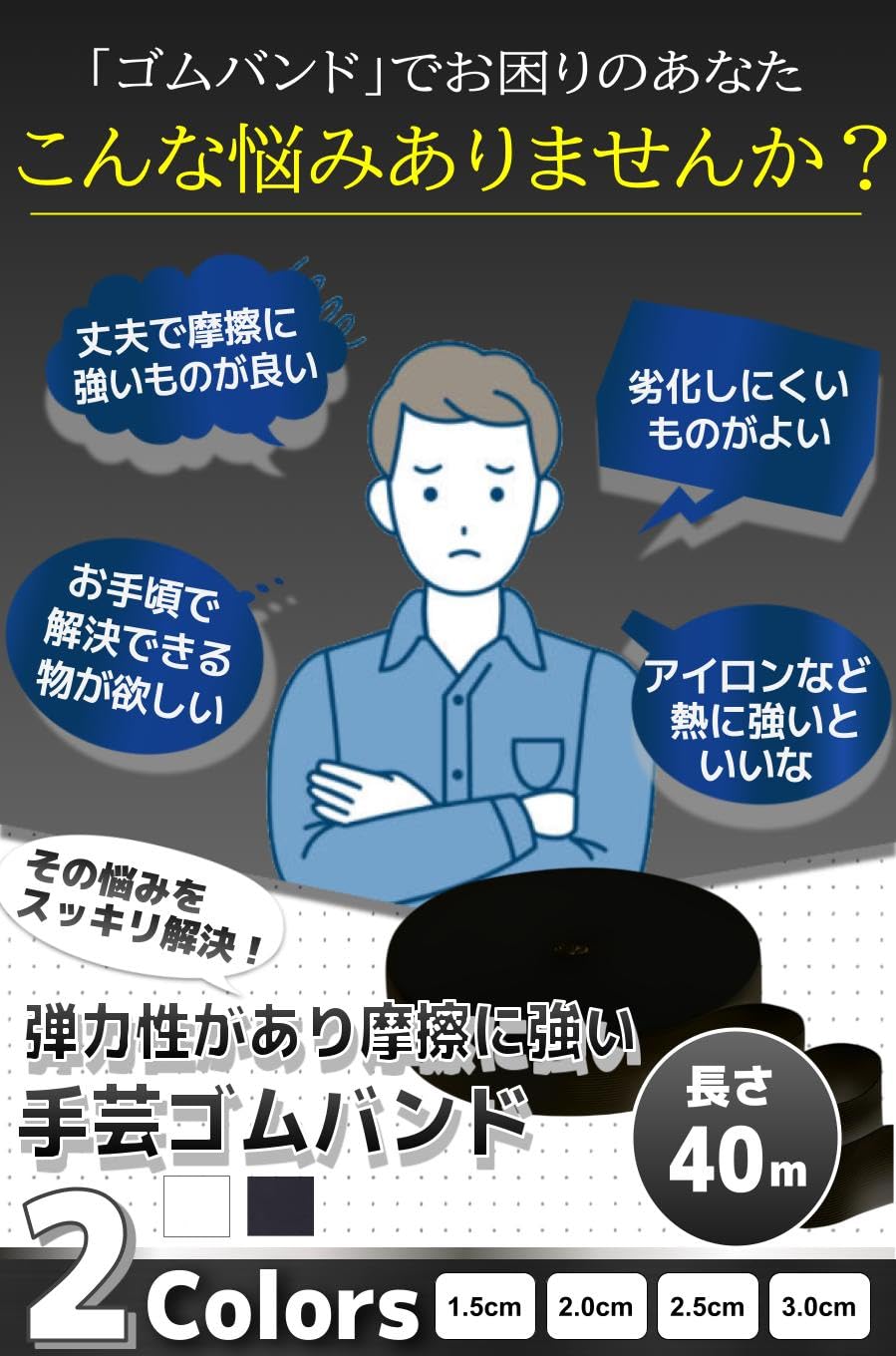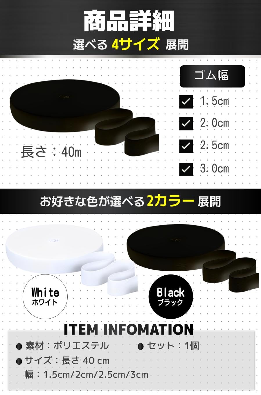 【商品特徴】①厚みのある素材 :丈夫な作りで摩擦や乾燥に強い /②繊細な編み目 :細かい編み目で肌触りも滑らか /③幅広い使用範囲 :衣類やバック、帽子など幅広く使える /④4つのサイズ展開 :目的や用途に応じてゴム幅が選べる【商品詳細】セット:1個素材:ポリエステル/サイズ:長さ 40m/幅1.5cm/2cm/2.5cm/3cm/