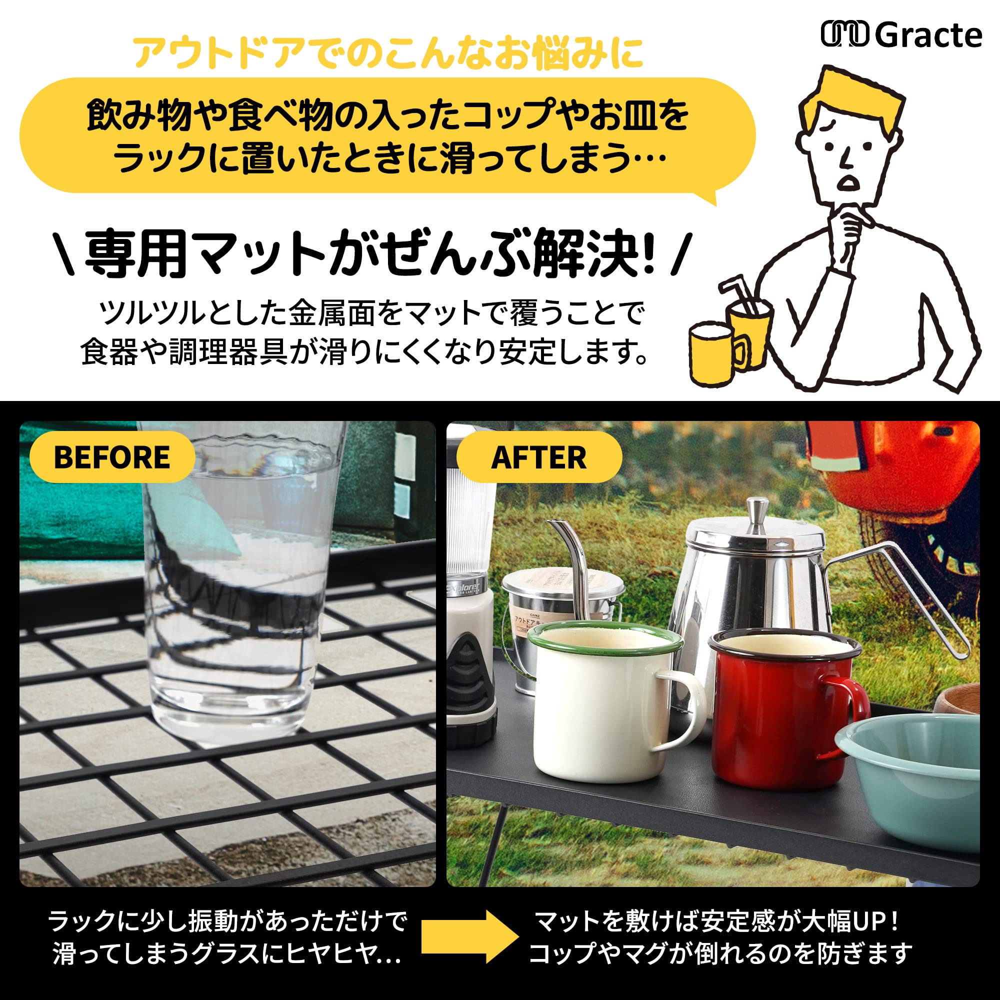 【安定感が大幅アップ】ツルツルとした金属面をマットで覆うと食器や調理器具が滑りにくくなり安定します。ラックに少し振動があっただけで滑ってしまうグラスにヒヤヒヤする必要はもうありません。ワレモノも安心してラック上に置くことができます。