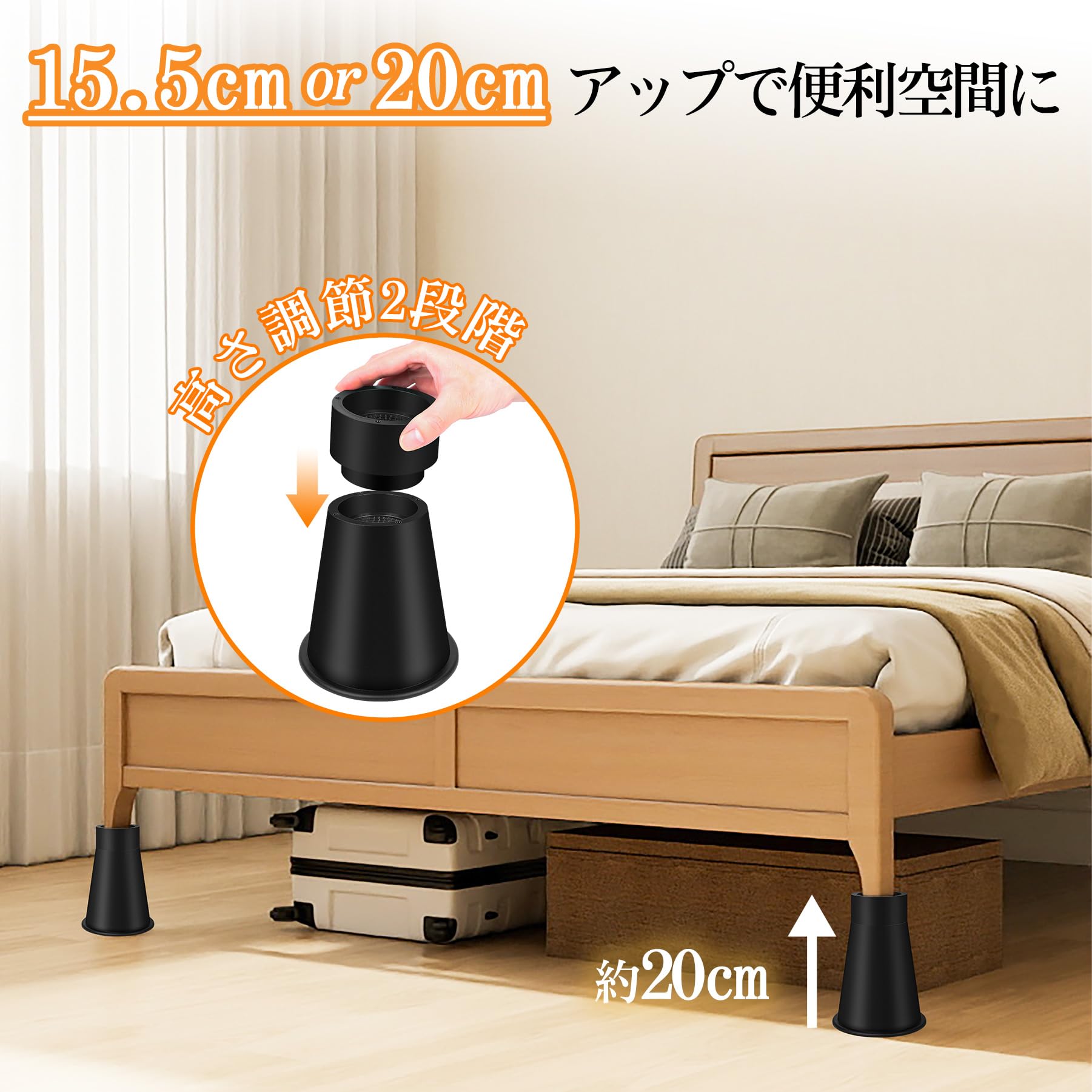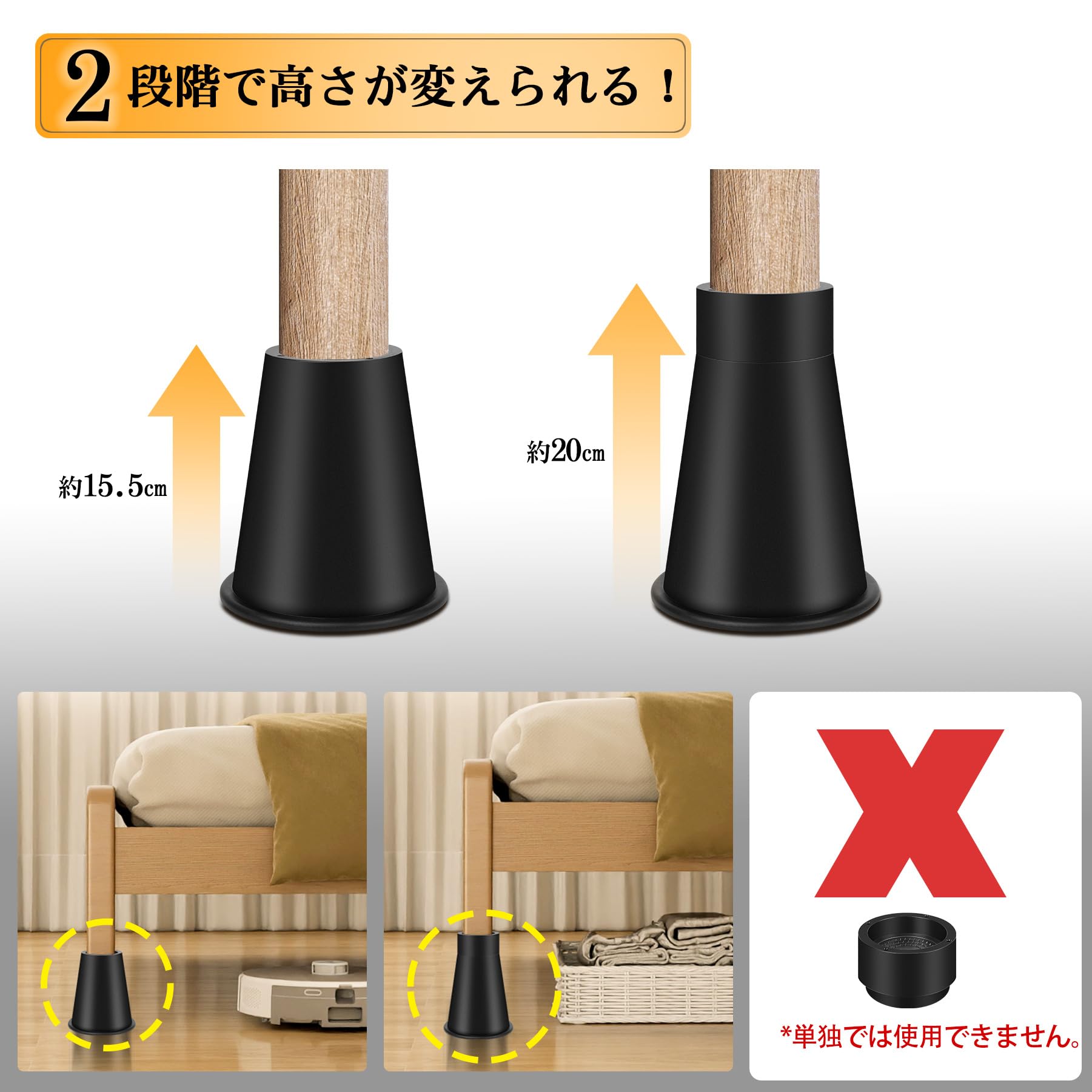 継ぎ脚 高さ調整脚 継足 2段階調整可能 延長脚 アジャスター ベッド テーブル ソファ 机 こたつ 高さを上げる足 テーブル脚台 多段階 高さ調節脚 暖房器具 家具 脚台 つぎあし 底上げ 2Way 15.5cm 20cm 丸型 ブラック