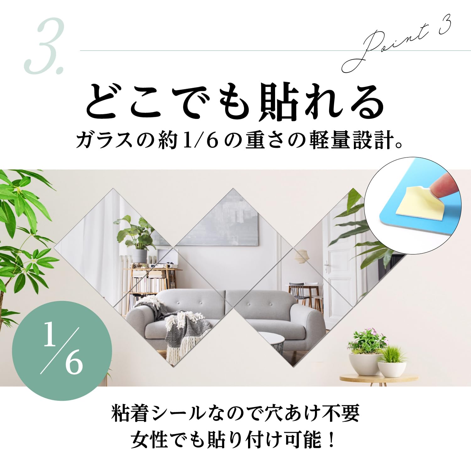 ??万が一、商品が破損して到着した場合は、お気軽に当店まで直接ご連絡ください。破損したミラーについては迅速に、返品なしで代品をお送りいたします。?【基本仕様】高さ150cm×横30cm(30cmx30cm5枚)コーナー直角加工。軽量(1枚当たり170g)のアクリル製で割れにくいため、落下しても飛散することがありません。縦に並べれば全身鏡に。ひし形でインテリアとして、一枚で髪型チェックなど配置次第で様々な使い方ができます。また、角を丸くカットしているためキッズ・赤ちゃんスペースで使用もできます。AHEARTのミラーは2人の専門家が監修した、理想のどこでも貼れる割れないミラーです。