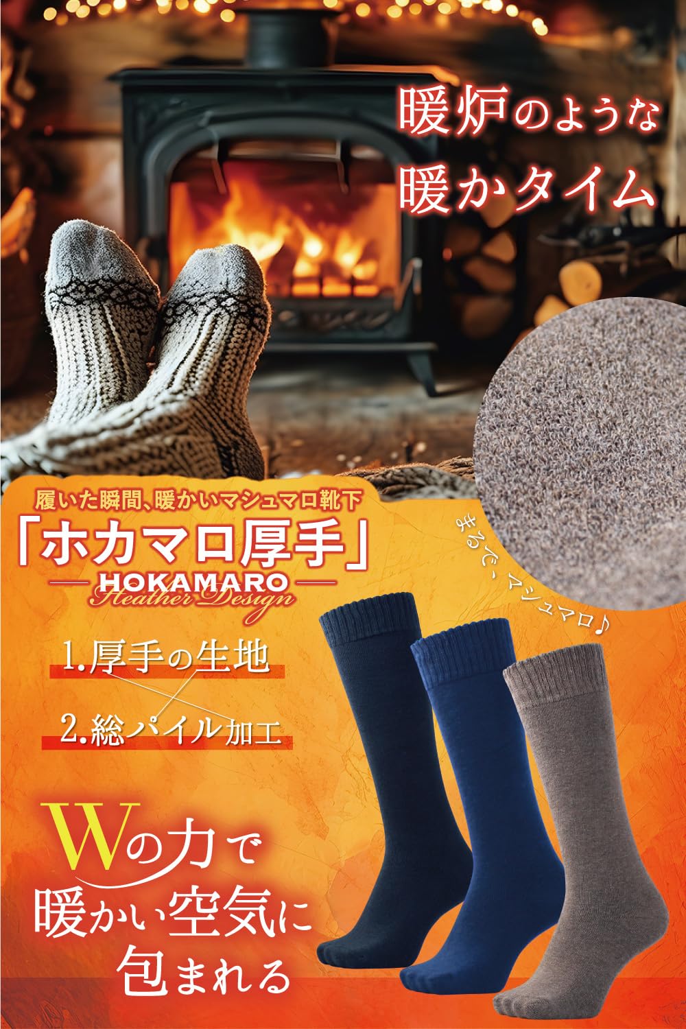 【ホカマロハイソックス】丈はつま先からひざ下まで覆う、約37cm?39cmのロング丈です。肌側はホカホカっでマシュマロのような肌触りのパイル地で、空気の層を保有して暖かいです。冷え性の方や寒い地域の方にもお勧めです。