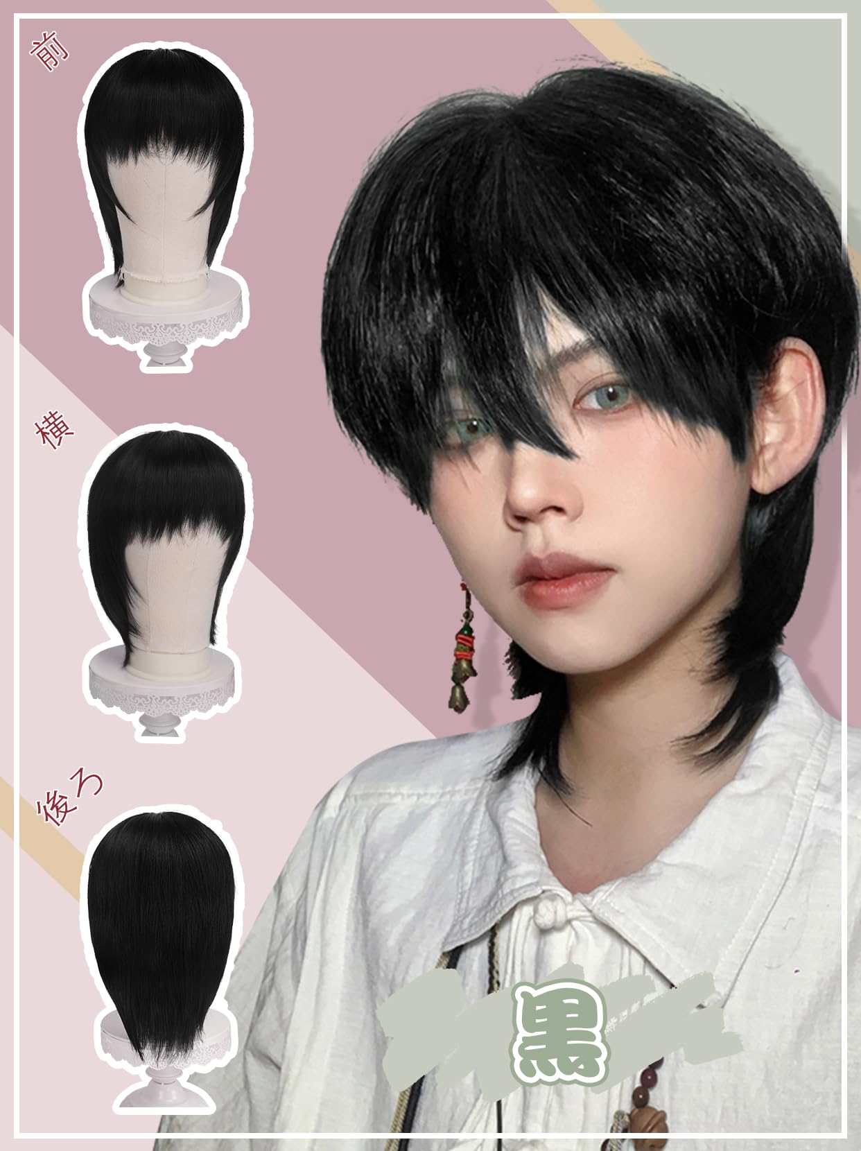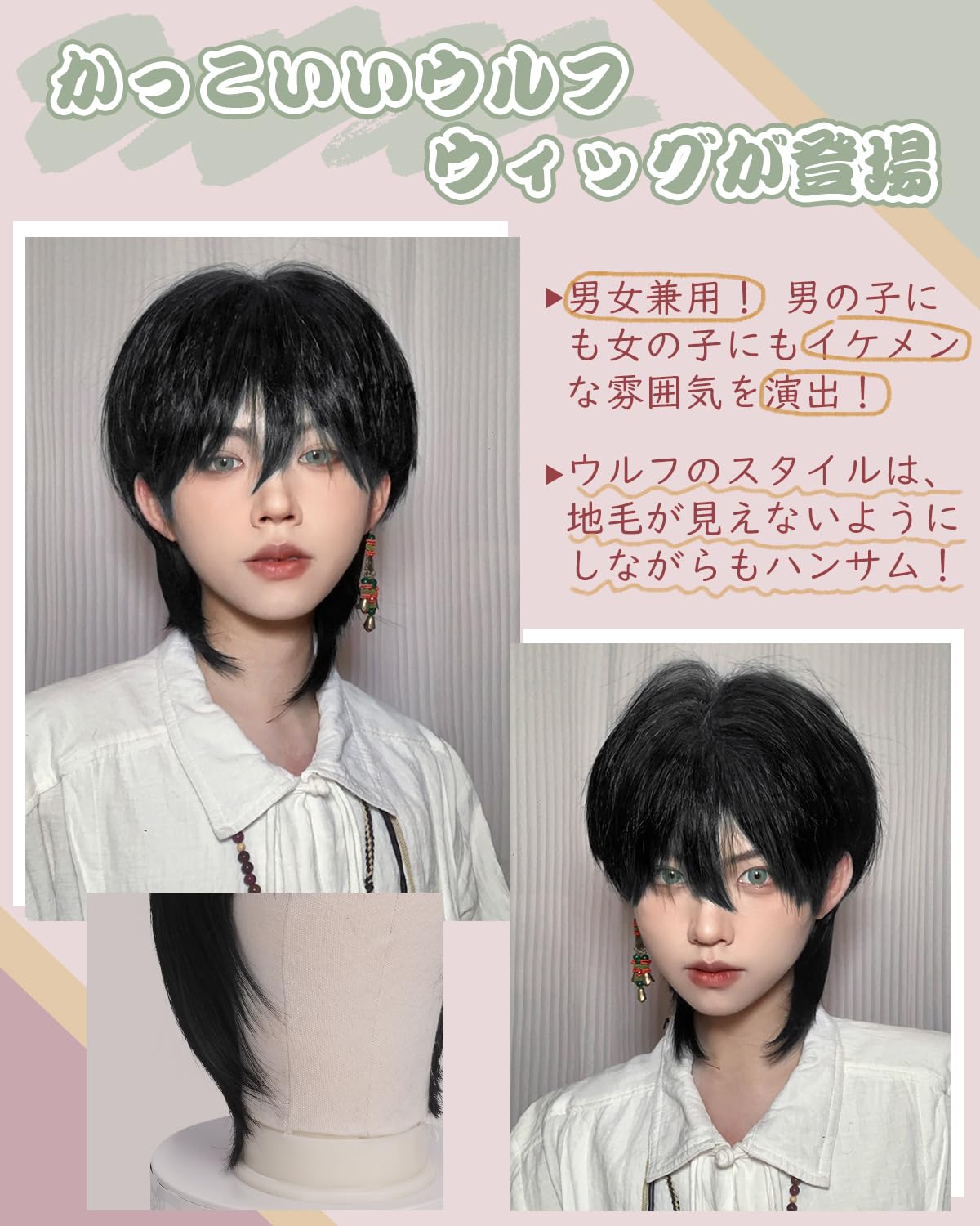 ■かっこいい!ウルフフルウィッグ■髪上部は丸みをつけたマッシュルームカット、下部にレイヤーを入れることで襟足部分を軽く仕上げるヘアスタイルです。襟足部分のレイヤーの様子が狼の毛先に似ています。あまり重くなくて、イケメンな雰囲気がいっぱい!