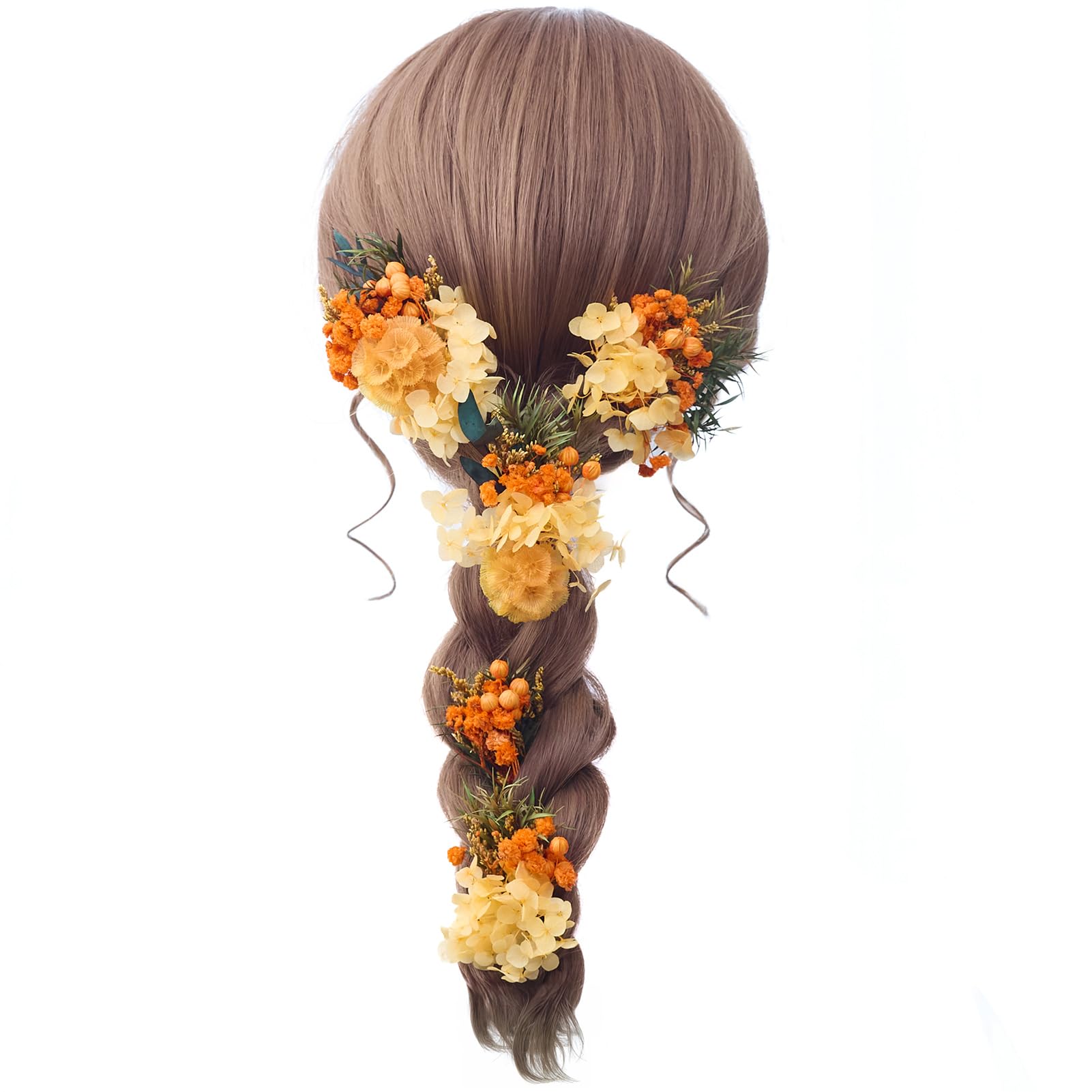 優雅な和風デザインのプリザーブドフラワーヘッドドレスで、特別な日をより思い出深いものに。淡い黄色とオレンジ色の花々が織りなす5つの小さなブーケは、それぞれが繊細な緑の葉と組み合わされ、自然な風合いを演出します。本物の花を丁寧に加工したプリザーブドフラワーは、長期間美しさを保ち続けます。結婚式やフォトウェディング、成人式など、特別なセレモニーにぴったりの上品な髪飾りです。茎部分は丁寧に巻かれており、様々なヘアスタイルに対応可能。繊細な花びらの質感と温かみのある色調が、着物やドレスを一層引き立てます。和装にも洋装にも調和する、季節を問わず使える上質なヘアアクセサリーです。
