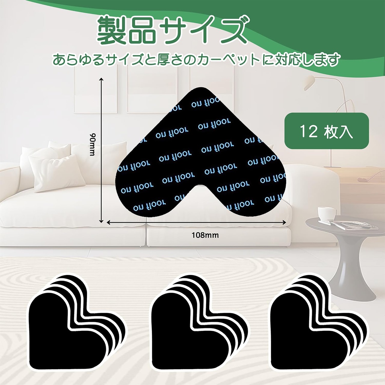 【特価】KANIYA 滑り止めシート カーペット滑り止めシート【超強力&床に傷つけない】転倒防止テープ 強力粘着マット 大判サイズ ズレない 貼るだけ固定でき 滑り止めマットテープ カーペット マット ラグ ソファなど様々なものに適しています (サイズ:108mmx90mm ハート形 12枚セット)