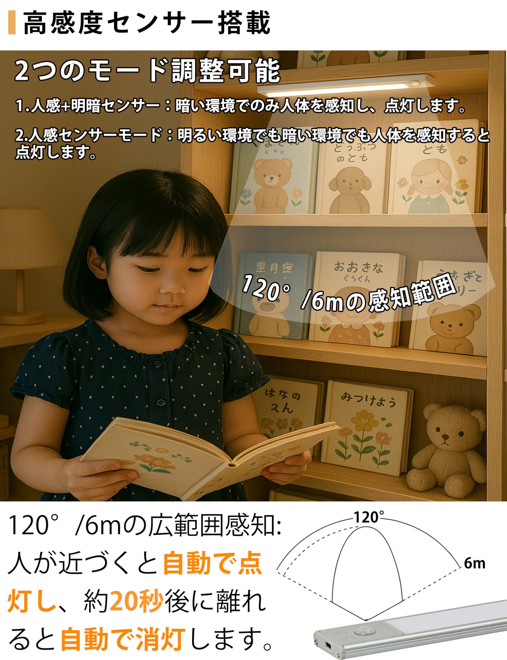 ?【高感度人感センサー搭載|じんかんせんさー ライト 室内】 最新の2025年モデルの人感センサーを採用し、最大120°・6m以内の動きを検知して自動点灯。動きを感知しない場合、約20秒で自動消灯します。「人感+明暗センサーモード」では暗い環境でのみ点灯し、「人感センサーモード」では明るさに関係なく動きを感知すると点灯します。 玄関や廊下、階段などにも最適なセンサーライトです。
