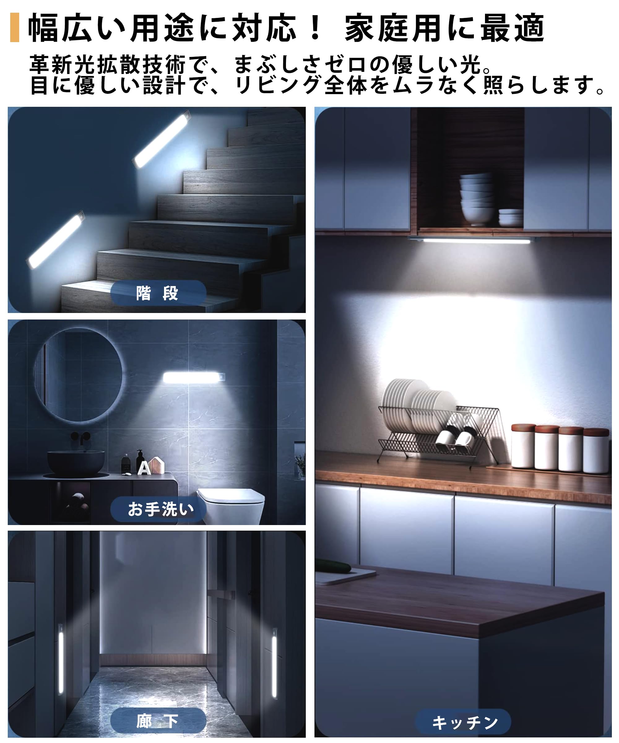 ?【工事不要・簡単設置|人感センサーライト led】 本体は3M両面テープでしっかり固定でき、さらにマグネット式で取り外しも簡単。キャビネット、クローゼット、寝室、廊下、玄関など様々な場所に設置可能なセンサーライト 室内です。配線不要で誰でも簡単に取り付け可能。