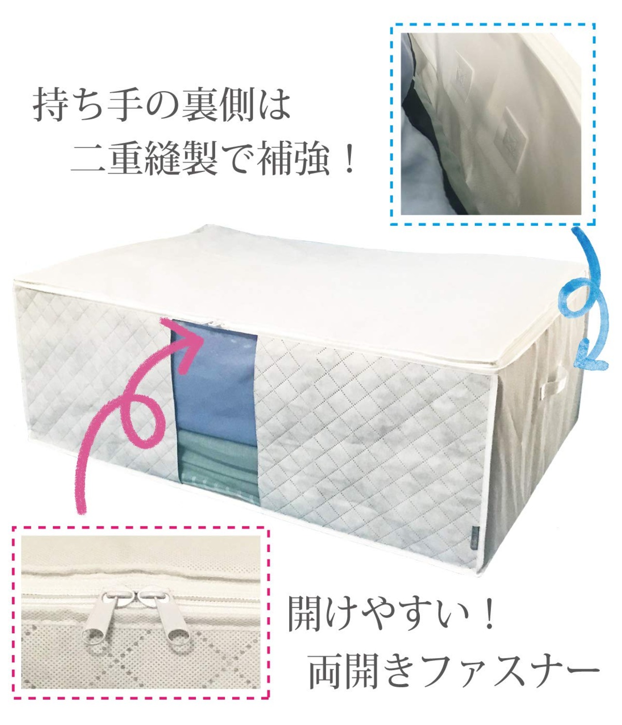 【透明窓・大きなファスナー・両サイド持ち手付】透明窓付きで収納した寝具が見える。大きく開く上部ファスナー式で出し入れも簡単。両サイド持ち手付で移動や持ち運びにも便利