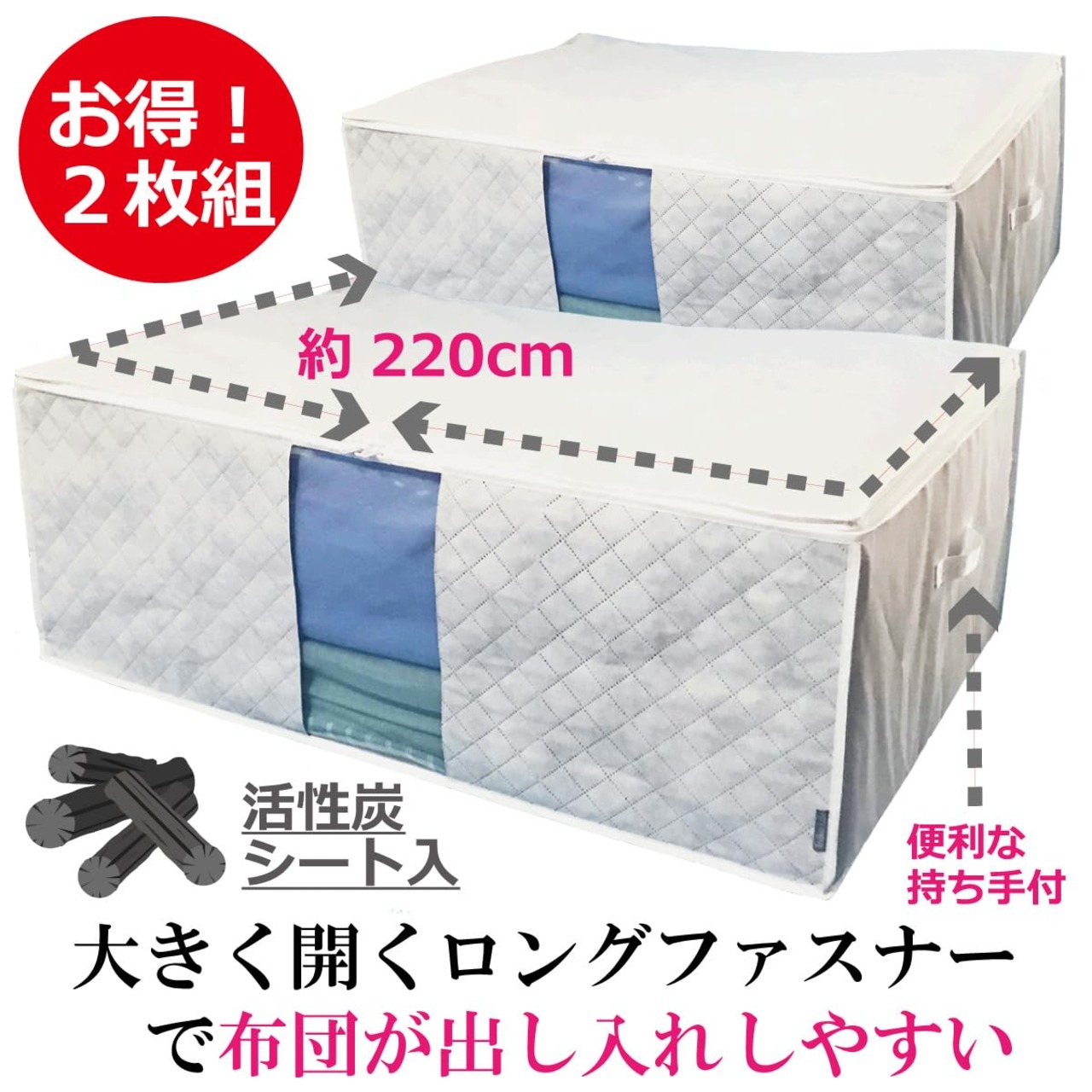 【在庫処分】ふとん 収納袋 2枚組 大容量 通気性の良い 厚手不織布製 布団ケース 前面活性炭シート入 掛け 敷き布団をまとめてスッキリ 敷布団収納袋 持ち手 透明窓付 大きく開くファスナー 使わない時は小さく畳める(中芯無し/ホワイト)