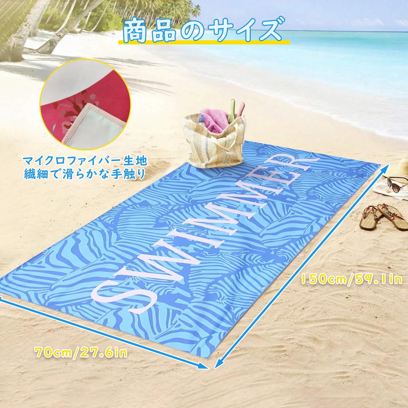 【Charming Decoration】ビーチタオル プールタオル セームタオル ビーチマット マイクロファイバー 大判 砂がつかない 速乾 吸水 薄型 柔らかい 軽量 コンパクト 持ち運び便利 ビーチブランケット 海水浴 プール 旅行 温泉用タオル (ブルーの夏)